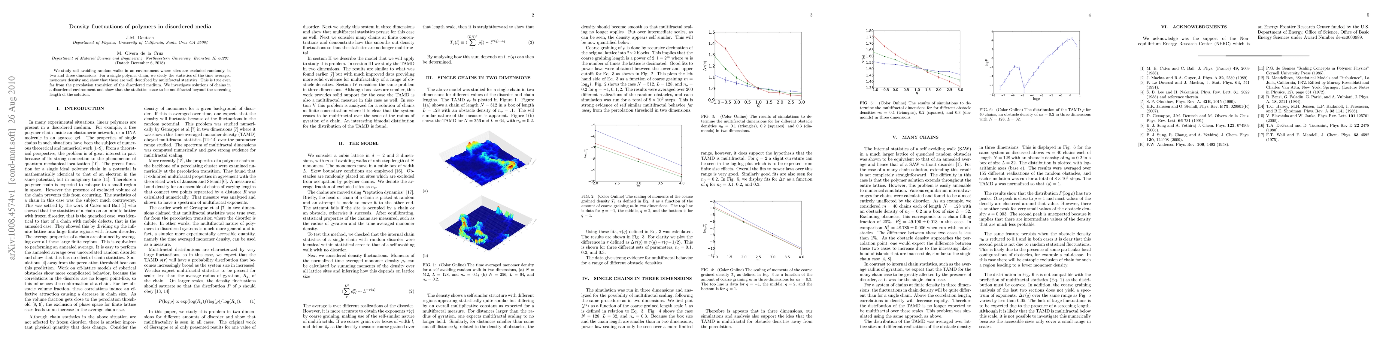We study self avoiding random walks in an environment where sites are excluded randomly, in two and three dimensions. For a single polymer chain, we study the statistics of the time averaged monomer density and show that these are well described by multifractal statistics. This is true even far from the percolation transition of the disordered medium. We investigate solutions of chains in a disordered environment and show that the statistics cease to be multifractal beyond the screening length of the solution.