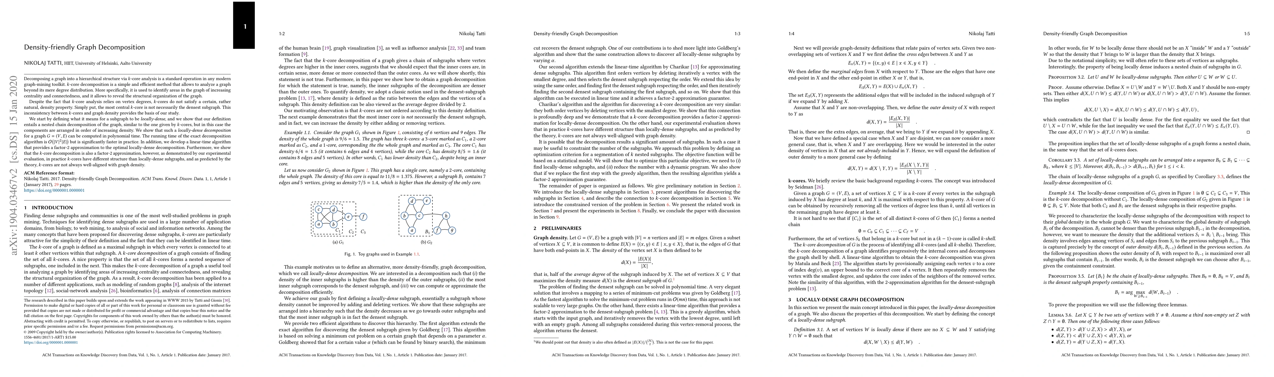 Decomposing a graph into a hierarchical structure via $k$-core analysis is a standard operation in any modern graph-mining toolkit. $k$-core decomposition is a simple and efficient method that allows to analyze a graph beyond its mere degree distribution. More specifically, it is used to identify areas in the graph of increasing centrality and connectedness, and it allows to reveal the structural organization of the graph. Despite the fact that $k$-core analysis relies on vertex degrees, $k$-cores do not satisfy a certain, rather natural, density property. Simply put, the most central $k$-core is not necessarily the densest subgraph. This inconsistency between $k$-cores and graph density provides the basis of our study. We start by defining what it means for a subgraph to be locally-dense, and we show that our definition entails a nested chain decomposition of the graph, similar to the one given by $k$-cores, but in this case the components are arranged in order of increasing density. We show that such a locally-dense decomposition for a graph $G=(V,E)$ can be computed in polynomial time. The running time of the exact decomposition algorithm is $O(|V|^2|E|)$ but is significantly faster in practice. In addition, we develop a linear-time algorithm that provides a factor-2 approximation to the optimal locally-dense decomposition. Furthermore, we show that the $k$-core decomposition is also a factor-2 approximation, however, as demonstrated by our experimental evaluation, in practice $k$-cores have different structure than locally-dense subgraphs, and as predicted by the theory, $k$-cores are not always well-aligned with graph density.