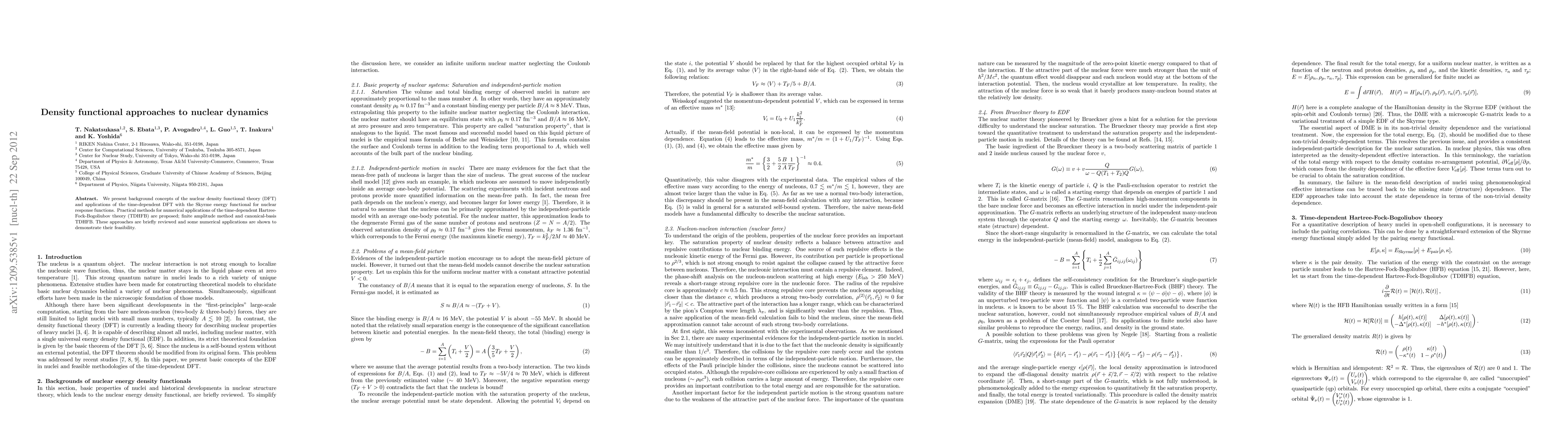 We present background concepts of the nuclear density functional theory (DFT) and applications of the time-dependent DFT with the Skyrme energy functional for nuclear response functions. Practical methods for numerical applications of the time-dependent Hartree-Fock-Bogoliubov theory (TDHFB) are proposed; finite amplitude method and canonical-basis TDHFB. These approaches are briefly reviewed and some numerical applications are shown to demonstrate their feasibility.