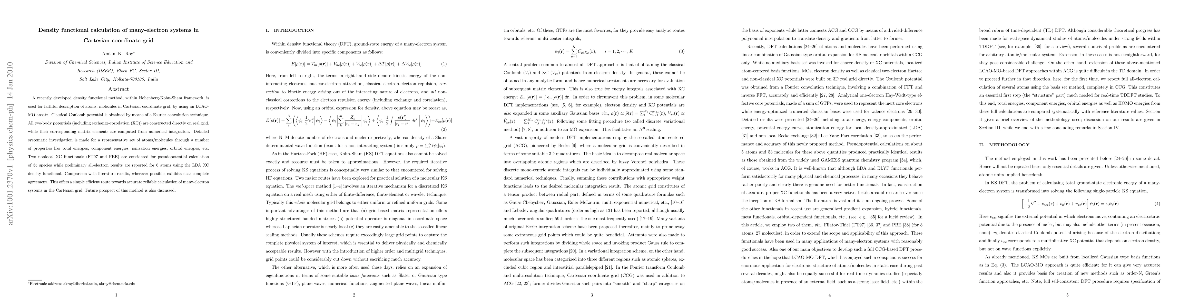 A recently developed density functional method, within Hohenberg-Kohn-Sham framework, is used for faithful description of atoms, molecules in Cartesian coordinate grid, by using an LCAO-MO ansatz. Classical Coulomb potential is obtained by means of a Fourier convolution technique. All two-body potentials (including exchange-correlation (XC)) are constructed directly on real grid, while their corresponding matrix elements are computed from numerical integration. Detailed systematic investigation is made for a representative set of atoms/molecules through a number of properties like total energies, component energies, ionization energies, orbital energies, etc. Two nonlocal XC functionals (FT97 and PBE) are considered for pseudopotential calculation of 35 species while preliminary all-electron results are reported for 6 atoms using the LDA XC density functional. Comparison with literature results, wherever possible, exhibits near-complete agreement. This offers a simple efficient route towards accurate reliable calculation of many-electron systems in the Cartesian grid. Future prospect of this method is also discussed.
