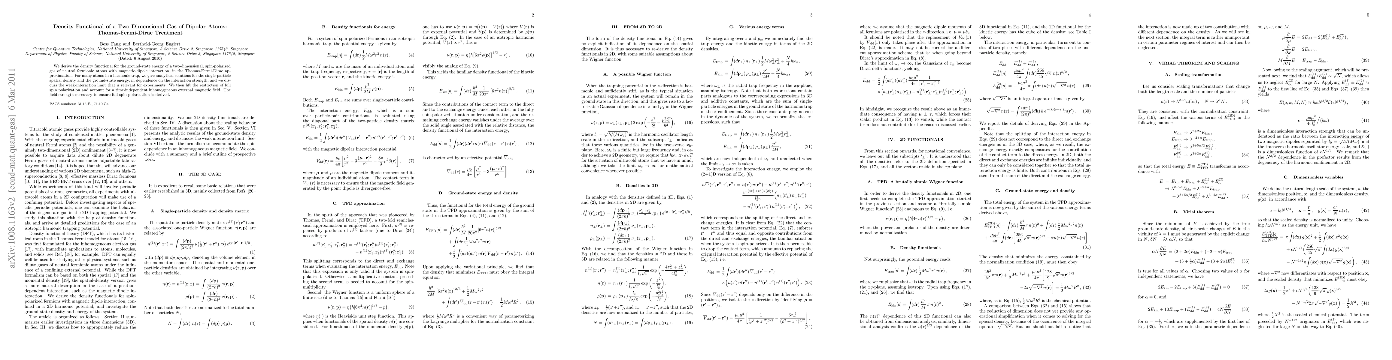 We derive the density functional for the ground-state energy of a two-dimensional, spin-polarized gas of neutral fermionic atoms with magnetic-dipole interaction, in the Thomas-Fermi-Dirac approximation. For many atoms in a harmonic trap, we give analytical solutions for the single-particle spatial density and the ground-state energy, in dependence on the interaction strength, and we discuss the weak-interaction limit that is relevant for experiments. We then lift the restriction of full spin polarization and account for a time-independent inhomogeneous external magnetic field. The field strength necessary to ensure full spin polarization is derived.