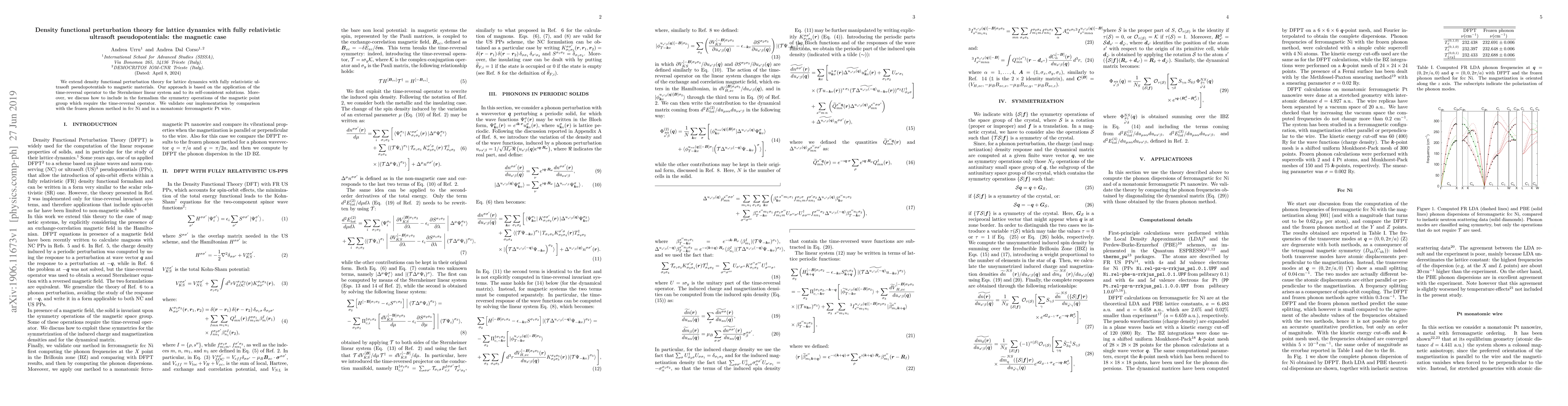 This paper extends density functional perturbation theory for lattice dynamics to magnetic materials using fully relativistic ultrasoft pseudopotentials, incorporating the time-reversal operator and magnetic point group symmetries. Validation is performed by comparing results with the frozen phonon method in fcc Ni and a ferromagnetic Pt wire.