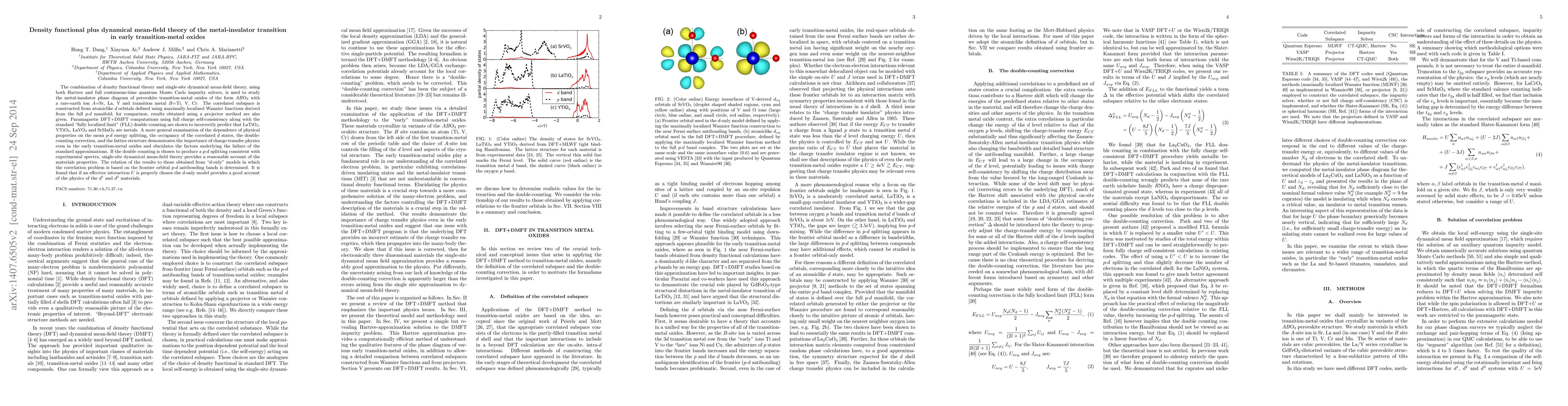The combination of density functional theory and single-site dynamical mean-field theory, using both Hartree and full continuous-time quantum Monte Carlo impurity solvers, is used to study the metal-insulator phase diagram of perovskite transition-metal oxides of the form $AB$O$_3$ with a rare-earth ion $A$=Sr, La, Y and transition metal $B$=Ti, V, Cr. The correlated subspace is constructed from atomiclike $d$ orbitals defined using maximally localized Wannier functions derived from the full $p$-$d$ manifold; for comparison, results obtained using a projector method are also given. Paramagnetic DFT+DMFT computations using full charge self-consistency along with the standard "fully localized limit" (FLL) double counting are shown to incorrectly predict that LaTiO$_3$, YTiO$_3$, LaVO$_3$ and SrMnO$_3$ are metals. A more general examination of the dependence of physical properties on the mean $p$-$d$ energy splitting, the occupancy of the correlated $d$ states, the double-counting correction, and the lattice structure demonstrates the importance of charge-transfer physics even in the early transition-metal oxides and elucidates the factors underlying the failure of the standard approximations. If the double counting is chosen to produce a $p$-$d$ splitting consistent with experimental spectra, single-site dynamical mean-field theory provides a reasonable account of the materials properties. The relation of the results to those obtained from "$d$-only" models in which the correlation problem is based on the frontier orbital $p$-$d$ antibonding bands is determined. It is found that if an effective interaction $U$ is properly chosen the $d$-only model provides a good account of the physics of the $d^1$ and $d^2$ materials.