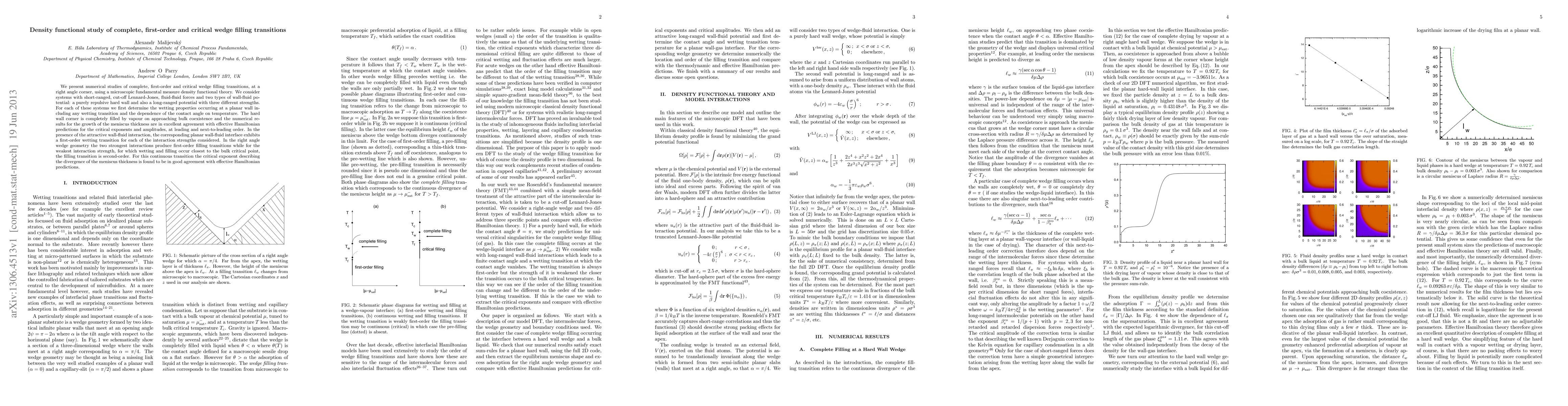 We present numerical studies of complete, first-order and critical wedge filling transitions, at a right angle corner, using a microscopic fundamental measure density functional theory. We consider systems with short-ranged, cut-off Lennard-Jones, fluid-fluid forces and two types of wall-fluid potential: a purely repulsive hard wall and also a long-ranged potential with three different strengths. For each of these systems we first determine the wetting properties occurring at a planar wall including any wetting transition and the dependence of the contact angle on temperature. The hard wall corner is completely filled by vapour on approaching bulk coexistence and the numerical results for the growth of the meniscus thickness are in excellent agreement with effective Hamiltonian predictions for the critical exponents and amplitudes, at leading and next-to-leading order. In the presence of the attractive wall-fluid interaction, the corresponding planar wall-fluid interface exhibits a first-order wetting transition for each of the interaction strengths considered. In the right angle wedge geometry the two strongest interactions produce first-order filling transitions while for the weakest interaction strength, for which wetting and filling occur closest to the bulk critical point, the filling transition is second-order. For this continuous transition the critical exponent describing the divergence of the meniscus thickness is found to be in good agreement with effective Hamiltonian predictions.