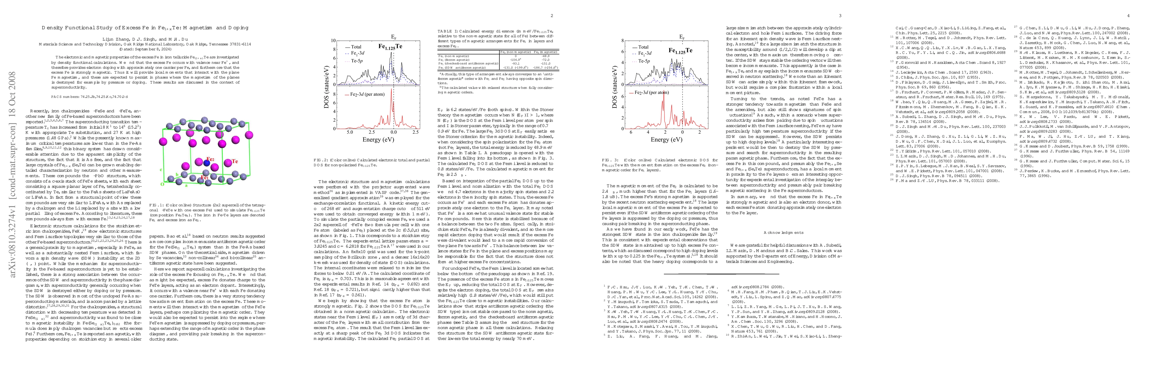 The electronic and magnetic properties of the excess Fe in iron telluride Fe$_{(1+x)}$Te are investigated by density functional calculations. We find that the excess Fe occurs with valence near Fe$^{+}$, and therefore provides electron doping with approximately one carrier per Fe, and furthermore that the excess Fe is strongly magnetic. Thus it will provide local moments that interact with the plane Fe magnetism, and these are expected to persist in phases where the magnetism of the planes is destroyed for example by pressure or doping. These results are discussed in the context of superconductivity.