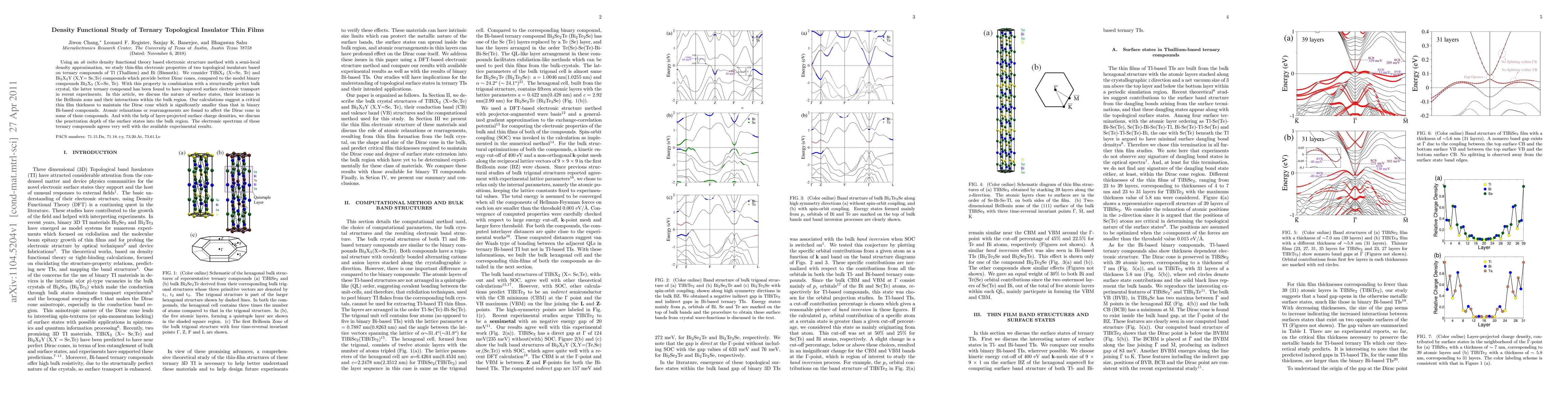 Using an ab-initio density functional theory based electronic structure method with a semi-local density approximation, we study thin-film electronic properties of two topological insulators based on ternary compounds of Tl (Thallium) and Bi (Bismuth). We consider TlBiX$_2$ (X=Se, Te) and Bi$_2$$X$_2$Y (X,Y= Se,Te) compounds which provide better Dirac cones, compared to the model binary compounds Bi$_2$X$_3$ (X=Se, Te). With this property in combination with a structurally perfect bulk crystal, the latter ternary compound has been found to have improved surface electronic transport in recent experiments. In this article, we discuss the nature of surface states, their locations in the Brillouin zone and their interactions within the bulk region. Our calculations suggest a critical thin film thickness to maintain the Dirac cone which is significantly smaller than that in binary Bi-based compounds. Atomic relaxations or rearrangements are found to affect the Dirac cone in some of these compounds. And with the help of layer-projected surface charge densities, we discuss the penetration depth of the surface states into the bulk region. The electronic spectrum of these ternary compounds agrees very well with the available experimental results.