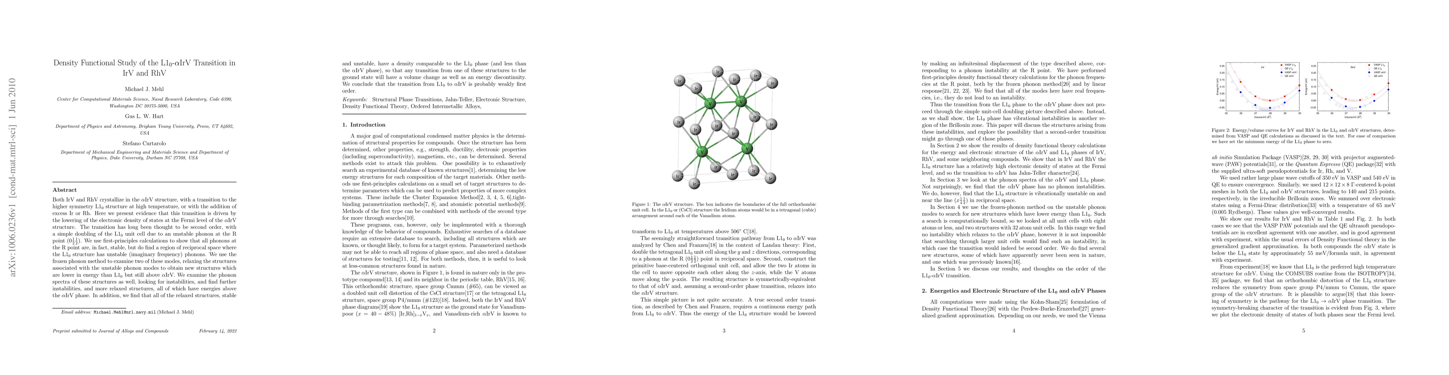 Both IrV and RhV crystallize in the alpha-IrV structure, with a transition to the higher symmetry L1_0 structure at high temperature, or with the addition of excess Ir or Rh. Here we present evidence that this transition is driven by the lowering of the electronic density of states at the Fermi level of the alpha-IrV structure. The transition has long been thought to be second order, with a simple doubling of the L1_0 unit cell due to an unstable phonon at the R point (0 1/2 1/2). We use first-principles calculations to show that all phonons at the R point are, in fact, stable, but do find a region of reciprocal space where the L1_0 structure has unstable (imaginary frequency) phonons. We use the frozen phonon method to examine two of these modes, relaxing the structures associated with the unstable phonon modes to obtain new structures which are lower in energy than L1_0 but still above alpha-IrV. We examine the phonon spectra of these structures as well, looking for instabilities, and find further instabilities, and more relaxed structures, all of which have energies above the alpha-IrV phase. In addition, we find that all of the relaxed structures, stable and unstable, have a density comparable to the L1_0 phase (and less than the alpha-IrV phase), so that any transition from one of these structures to the ground state will have a volume change as well as an energy discontinuity. We conclude that the transition from L1_0 to alpha-IrV is probably weakly first order.