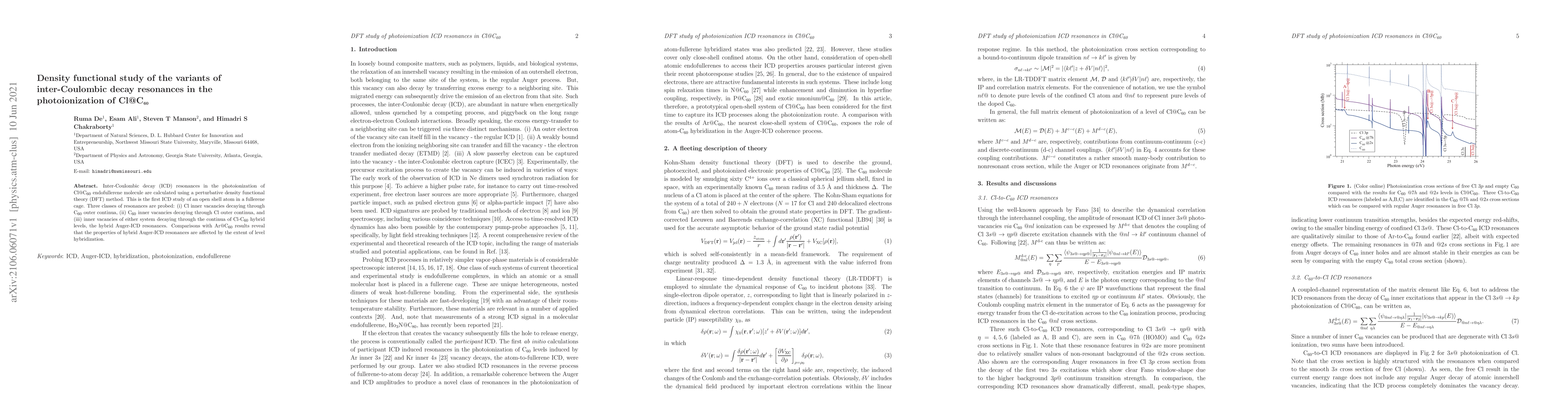 This study employs perturbative density functional theory to investigate inter-Coulombic decay resonances in the photoionization of Cl@C60, focusing on three classes of decay processes. The findings reveal that the properties of hybrid Auger-ICD resonances are influenced by the degree of level hybridization, distinguishing this from previous studies on Ar@C60.