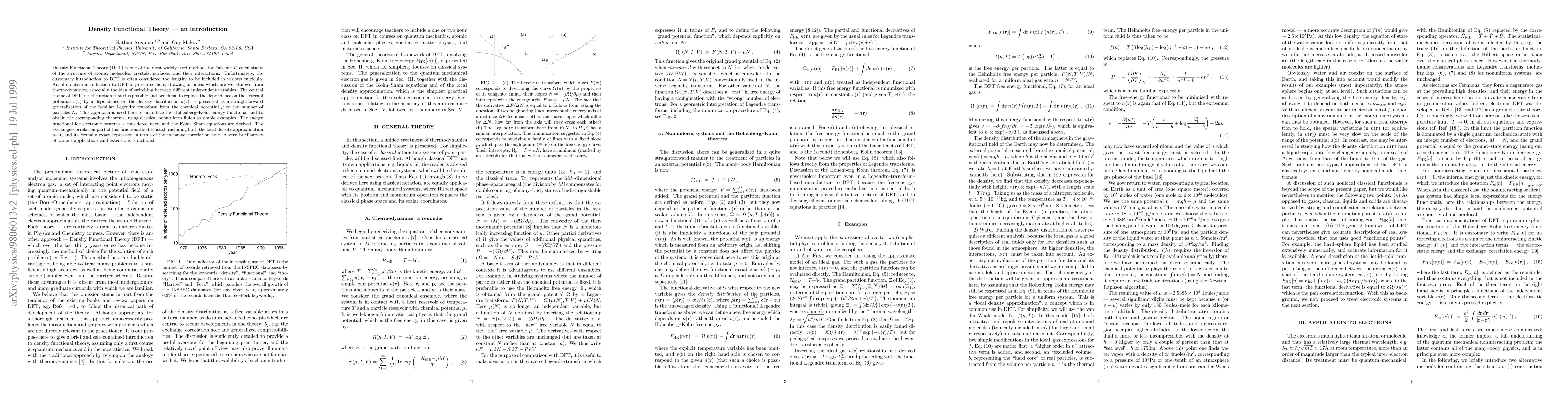 Density Functional Theory (DFT) is one of the most widely used methods for "ab initio" calculations of the structure of atoms, molecules, crystals, surfaces, and their interactions. Unfortunately, the customary introduction to DFT is often considered too lengthy to be included in various curricula. An alternative introduction to DFT is presented here, drawing on ideas which are well-known from thermodynamics, especially the idea of switching between different independent variables. The central theme of DFT, i.e. the notion that it is possible and beneficial to replace the dependence on the external potential v(r) by a dependence on the density distribution n(r), is presented as a straightforward generalization of the familiar Legendre transform from the chemical potential (\mu) to the number of particles (N). This approach is used here to introduce the Hohenberg-Kohn energy functional and to obtain the corresponding theorems, using classical nonuniform fluids as simple examples. The energy functional for electronic systems is considered next, and the Kohn-Sham equations are derived. The exchange-correlation part of this functional is discussed, including both the local density approximation to it, and its formally exact expression in terms of the exchange-correlation hole. A very brief survey of various applications and extensions is included.