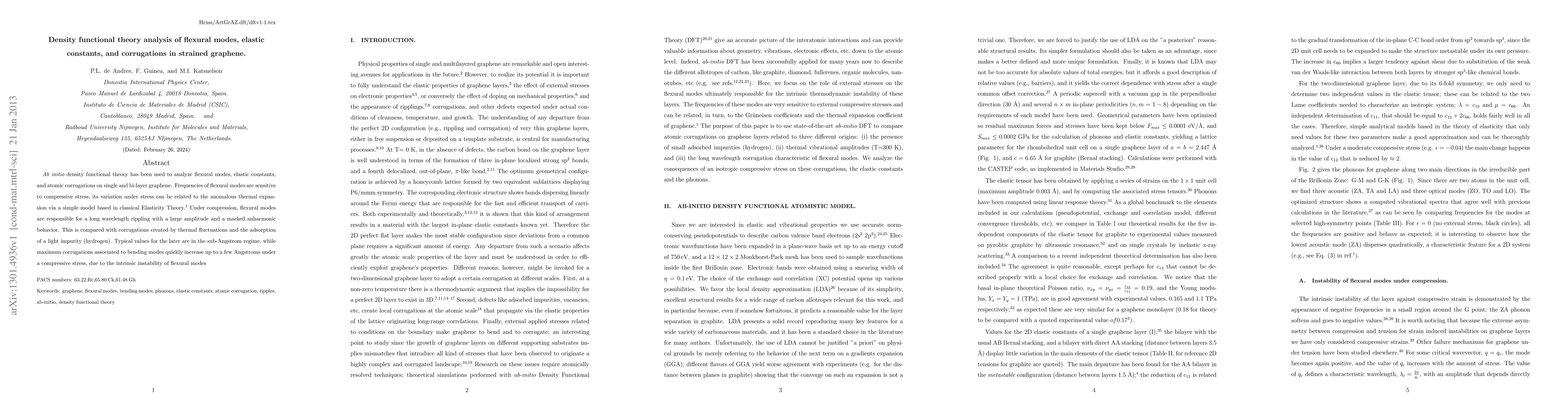 Ab initio density functional theory has been used to analyze flexural modes, elastic constants, and atomic corrugations on single and bi-layer graphene. Frequencies of flexural modes are sensitive to compressive stress; its variation under stress can be related to the anomalous thermal expansion via a simple model based in classical Elasticity Theory [Phys. Rev. B 86, 144103]. Under compression, flexural modes are responsible for a long wavelength rippling with a large amplitude and a marked anharmonic behavior. This is compared with corrugations created by thermal fluctuations and the adsorption of a light impurity (hydrogen). Typical values for the later are in the sub-Angstrom regime, while maximum corrugations associated to bending modes quickly increase up to a few Angstroms under a compressive stress, due to the intrinsic instability of flexural modes