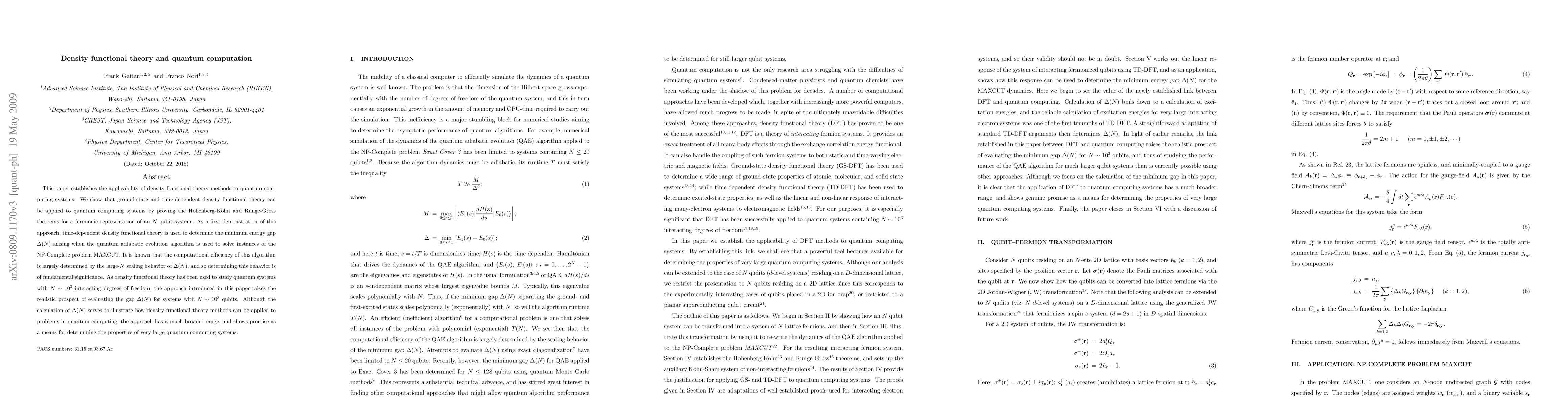 This paper demonstrates the application of density functional theory to quantum computing, proving its theorems for an N qubit system and using time-dependent density functional theory to determine the energy gap Delta(N) in the MAXCUT problem. The approach has potential for evaluating properties of large quantum systems, such as those with N ~ 1000 qubits.