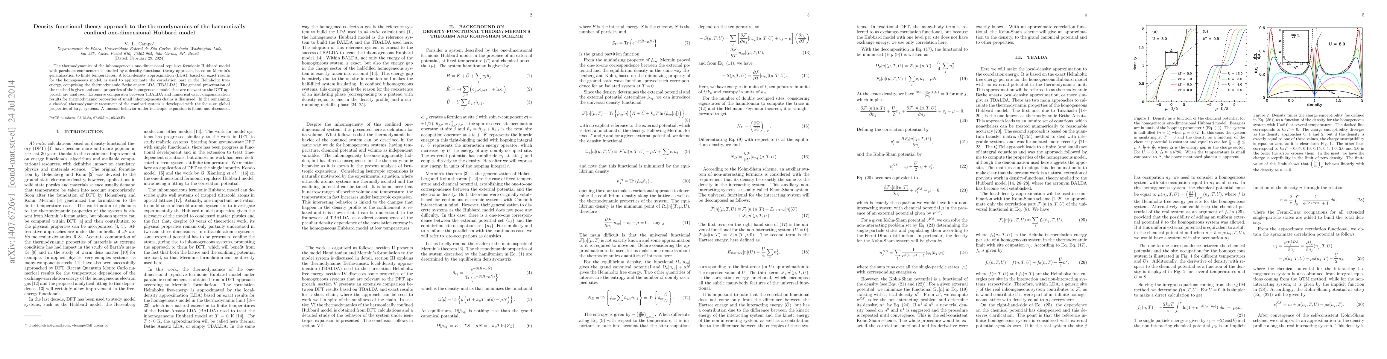 This paper employs density-functional theory to study the thermodynamics of the one-dimensional Hubbard model under parabolic confinement, using a local-density approximation to approximate the correlation part. It compares theoretical results with exact numerical calculations and highlights unusual thermodynamic behavior during isentropic expansion.