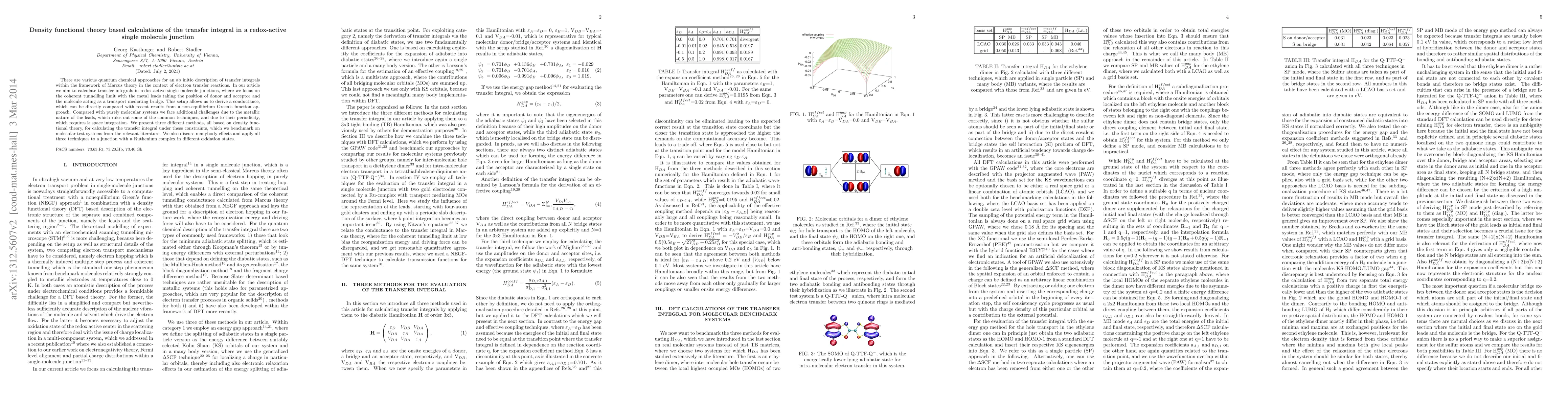 There are various quantum chemical approaches for an ab initio description of transfer integrals within the framework of Marcus theory in the context of electron transfer reactions. In our article we aim to calculate transfer integrals in redox-active single molecule junctions, where we focus on the coherent tunneling limit with the metal leads taking the position of donor and acceptor and the molecule acting as a transport mediating bridge. This setup allows us to derive a conductance, which can be directly compared with recent results from a non-equilibrium Green's function approach. Compared with purely molecular systems we face additional challenges due to the metallic nature of the leads, which rules out some of the common techniques, and due to their periodicity, which requires {\bf k} space integration. We present three different methods, all based on density functional theory, for calculating the transfer integral under these constraints, which we benchmark on molecular test systems from the relevant literature. We also discuss manybody effects and apply all three techniques to a junction with a Ruthenium complex in different oxidation states.