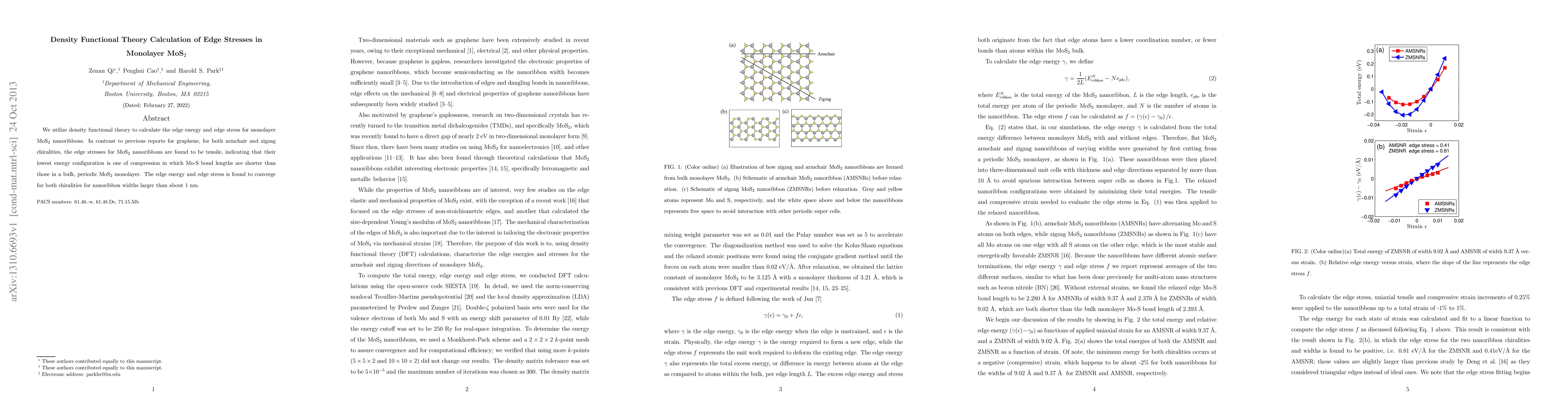 Density functional theory reveals that edge stresses in monolayer MoS$_2$ nanoribbons are tensile, contrasting with compressive stresses in graphene, and the lowest energy configuration for MoS$_2$ involves compressed Mo-S bonds. Edge energy and stress converge for nanoribbon widths above 1 nm.