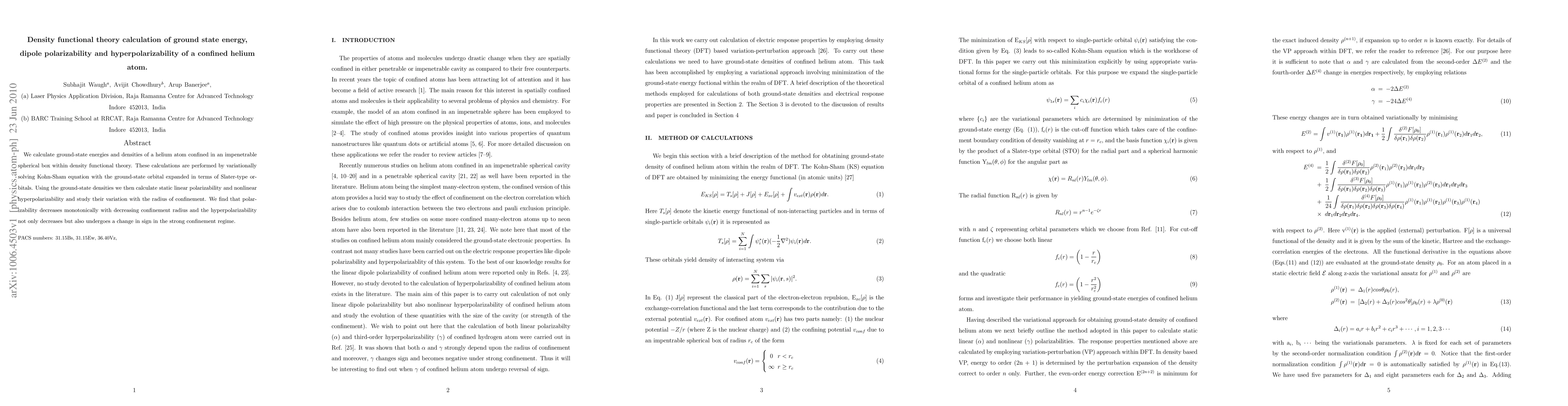 This paper uses density functional theory to calculate the ground state energy, density, linear polarizability, and nonlinear hyperpolarizability of a confined helium atom. It finds that polarizability decreases with confinement radius, while hyperpolarizability decreases and changes sign under strong confinement.