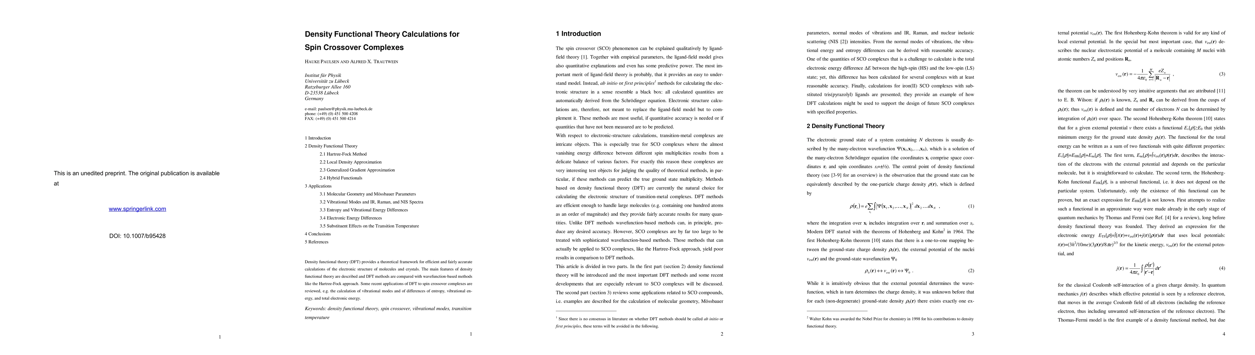 This paper reviews the application of density functional theory (DFT) for calculating the electronic structure of spin crossover complexes, comparing DFT methods with wavefunction-based approaches, and highlighting recent DFT applications in determining Mössbauer parameters, vibrational modes, and energy differences between high-spin and low-spin states.
