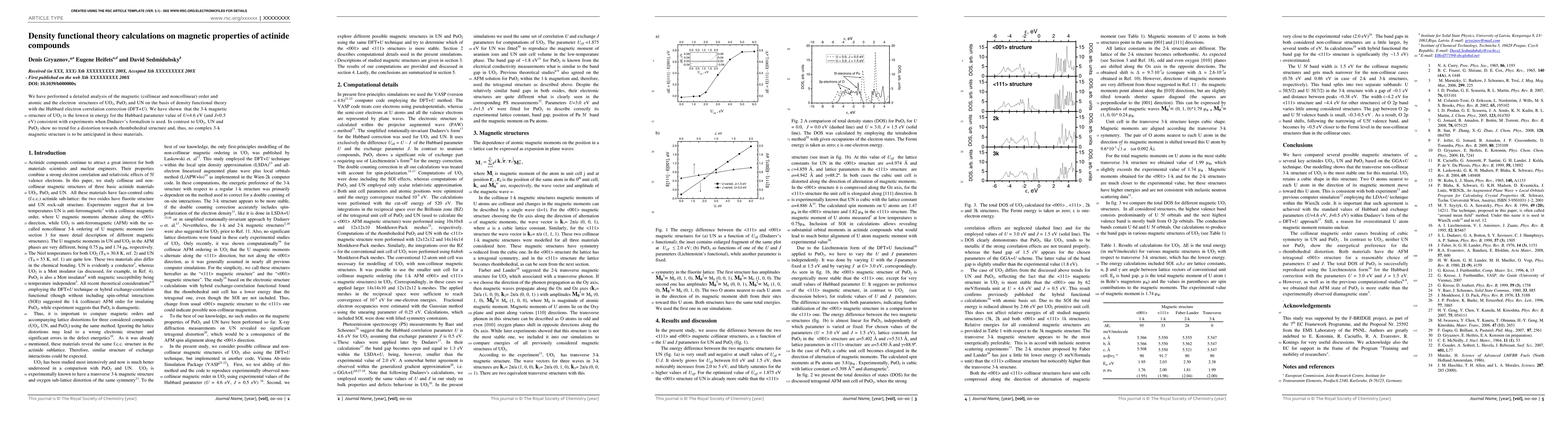 This study uses density functional theory with Hubbard correction to analyze the magnetic properties of actinide compounds UO2, PuO2, and UN. UO2 exhibits a 3-k magnetic structure at U=4.6 eV, aligning with experimental data, while UN and PuO2 do not show a trend towards complex magnetic structures.