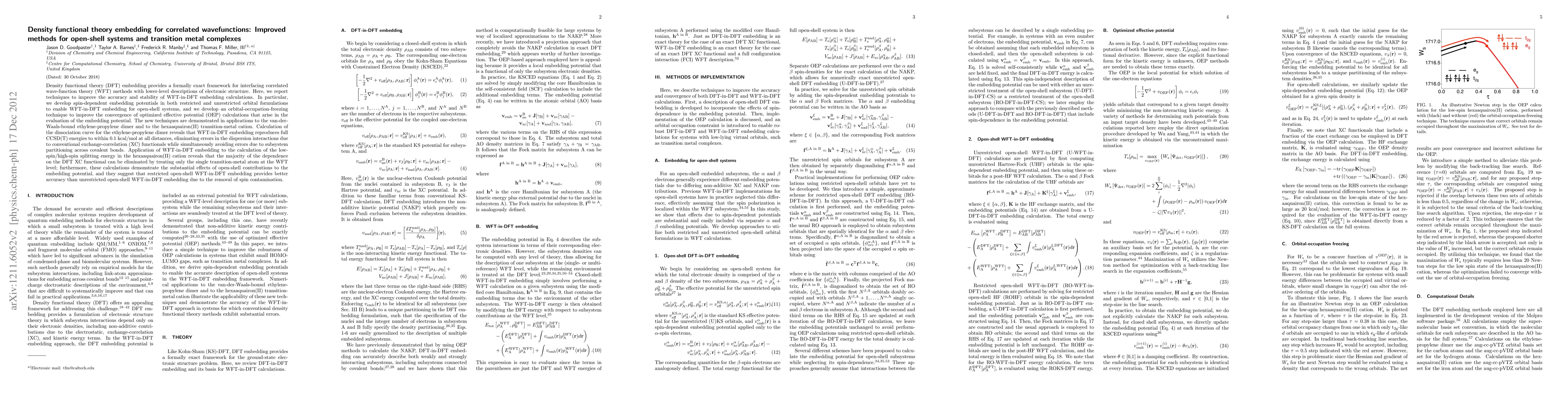 This paper introduces advanced techniques for density functional theory (DFT) embedding to improve the accuracy and stability of correlated wavefunction theory (WFT) calculations, particularly for open-shell systems and transition metal complexes. The new methods, including spin-dependent embedding potentials and orbital-occupation-freezing, demonstrate high accuracy in modeling van-der-Waals interactions and transition metal properties.