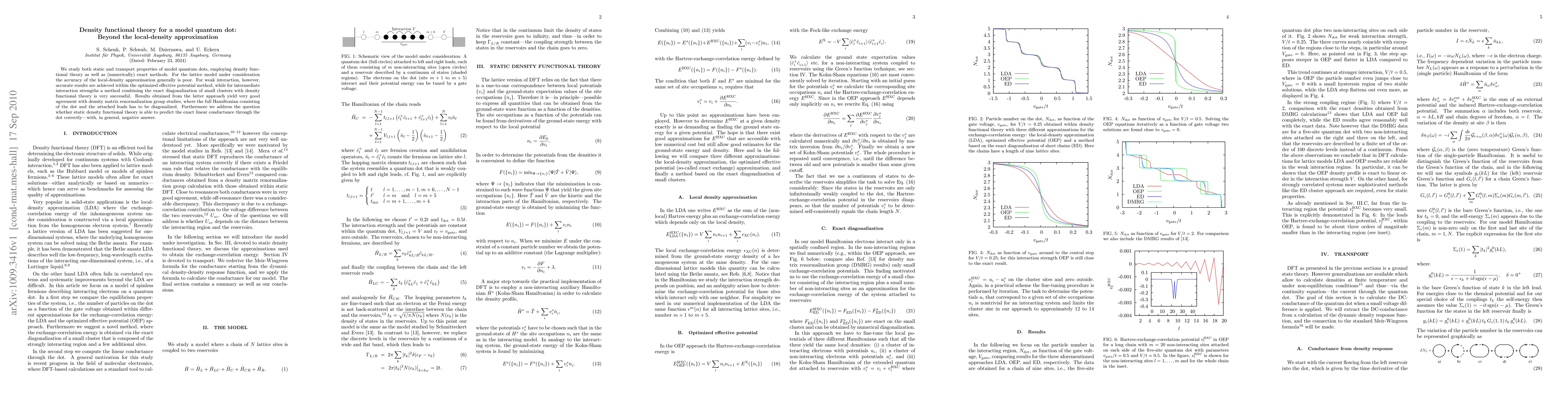 We study both static and transport properties of model quantum dots, employing density functional theory as well as (numerically) exact methods. For the lattice model under consideration the accuracy of the local-density approximation generally is poor. For weak interaction, however, accurate results are achieved within the optimized effective potential method, while for intermediate interaction strengths a method combining the exact diagonalization of small clusters with density functional theory is very successful. Results obtained from the latter approach yield very good agreement with density matrix renormalization group studies, where the full Hamiltonian consisting of the dot and the attached leads has to be diagonalized. Furthermore we address the question whether static density functional theory is able to predict the exact linear conductance through the dot correctly - with, in general, negative answer.