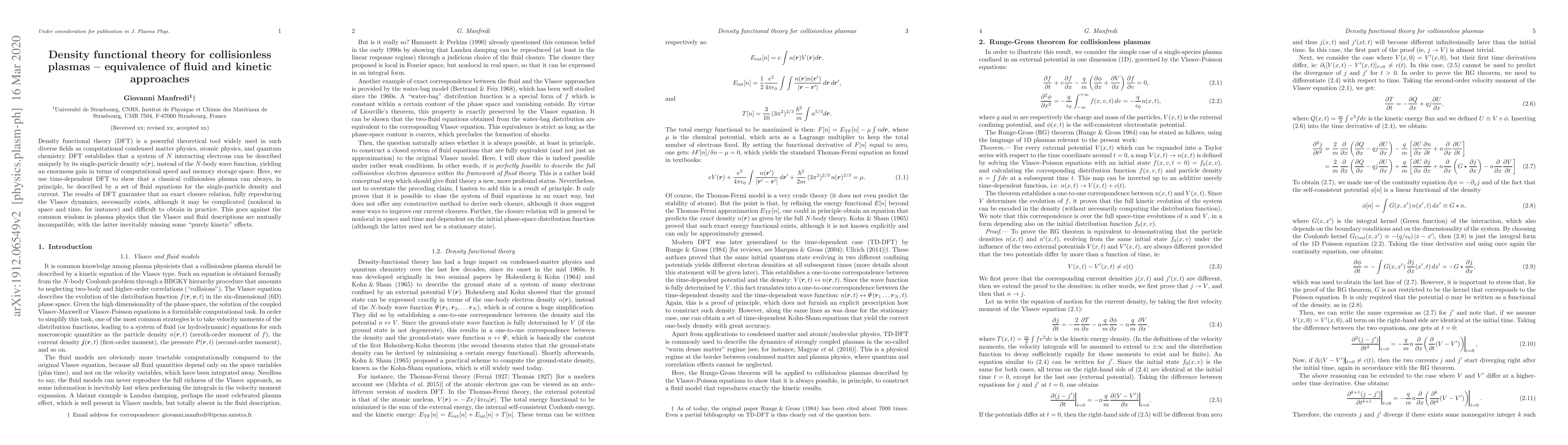 Density functional theory (DFT) is a powerful theoretical tool widely used in such diverse fields as computational condensed matter physics, atomic physics, and quantum chemistry. DFT establishes that a system of $N$ interacting electrons can be described uniquely by its single-particle density $n(\boldsymbol{r})$, instead of the $N$-body wave function, yielding an enormous gain in terms of computational speed and memory storage space. Here, we use time-dependent DFT to show that a classical collisionless plasma can always, in principle, be described by a set of fluid equations for the single-particle density and current. The results of DFT guarantee that an exact closure relation, fully reproducing the Vlasov dynamics, necessarily exists, although it may be complicated (nonlocal in space and time, for instance) and difficult to obtain in practice. This goes against the common wisdom in plasma physics that the Vlasov and fluid descriptions are mutually incompatible, with the latter inevitably missing some "purely kinetic" effects.