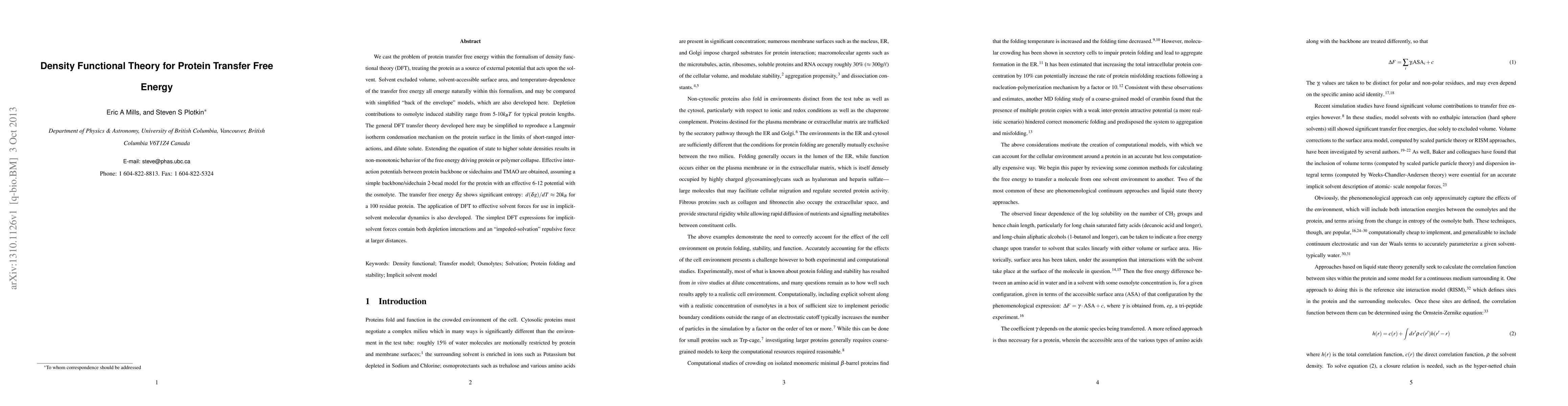 This paper applies density functional theory (DFT) to model protein transfer free energy, showing how solvent effects, temperature dependence, and osmolyte interactions naturally emerge within this framework. The study also develops simplified models for comparison and explores the entropy contributions to the transfer free energy, revealing significant entropy effects.