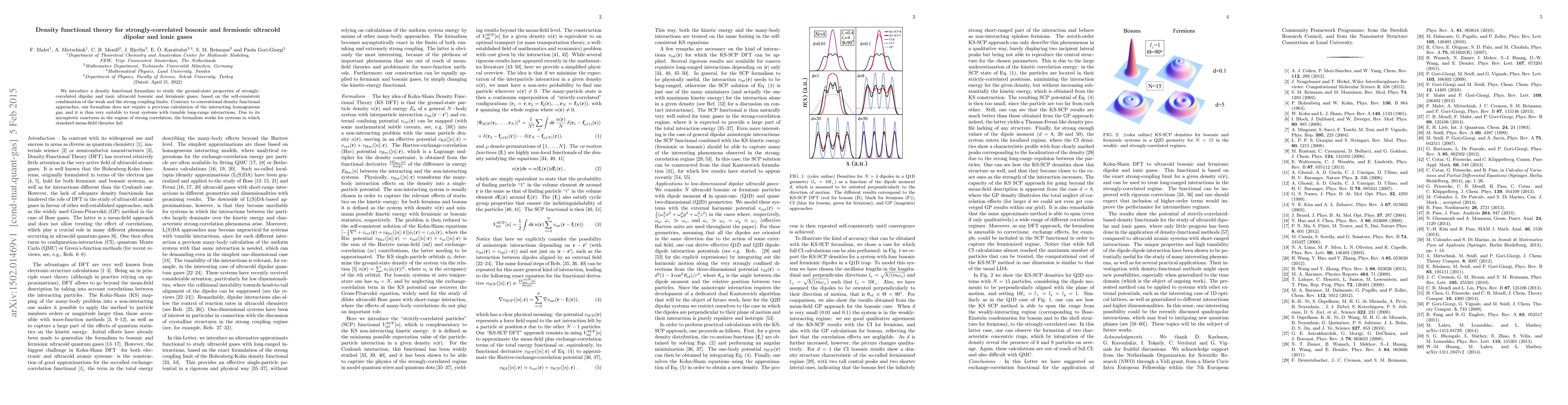 We introduce a density functional formalism to study the ground-state properties of strongly-correlated dipolar and ionic ultracold bosonic and fermionic gases, based on the self-consistent combination of the weak and the strong coupling limits. Contrary to conventional density functional approaches, our formalism does not require a previous calculation of the interacting homogeneous gas, and it is thus very suitable to treat systems with tunable long-range interactions. Due to its asymptotic exactness in the regime of strong correlation, the formalism works for systems in which standard mean-field theories fail.
