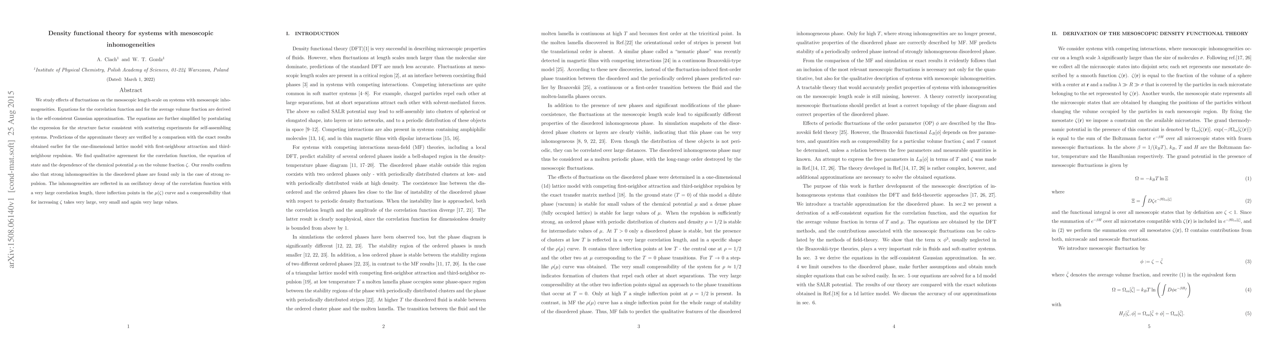 We study effects of fluctuations on the mesoscopic length-scale on systems with mesoscopic inhomogeneities. Equations for the correlation function and for the average volume fraction are derived in the self-consistent Gaussian approximation. The equations are further simplified by postulating the expression for the structure factor consistent with scattering experiments for self-assembling systems. Predictions of the approximate theory are verified by a comparison with the exact results obtained earlier for the one-dimensional lattice model with first-neighbour attraction and third-neighbour repulsion. We find qualitative agreement for the correlation function, the equation of state and the dependence of the chemical potential $\mu$ on the volume fraction $\zeta$. Our results confirm also that strong inhomogeneities in the disordered phase are found only in the case of strong repulsion. The inhomogeneities are reflected in an oscillatory decay of the correlation function with a very large correlation length, three inflection points in the $\mu(\zeta)$ curve and a compressibility that for increasing $\zeta$ takes very large, very small and again very large values.