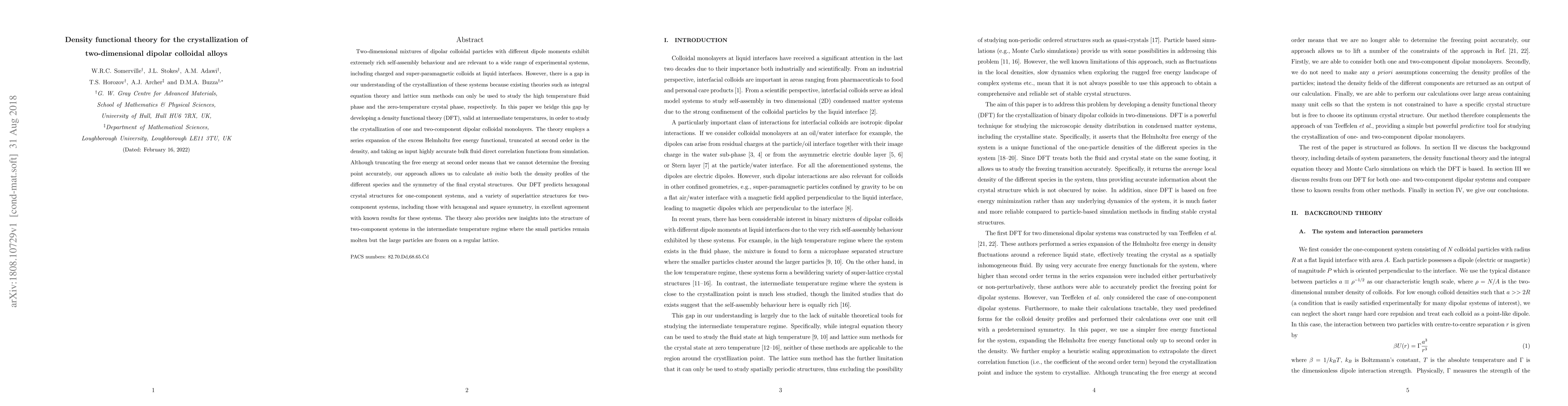 This paper develops a density functional theory (DFT) to study the crystallization of two-dimensional dipolar colloidal alloys at intermediate temperatures, providing insights into the density profiles and crystal structures of one and two-component systems, predicting hexagonal and various superlattice structures. The DFT bridges the gap between existing theories that only cover high-temperature fluid or zero-temperature crystal phases.
