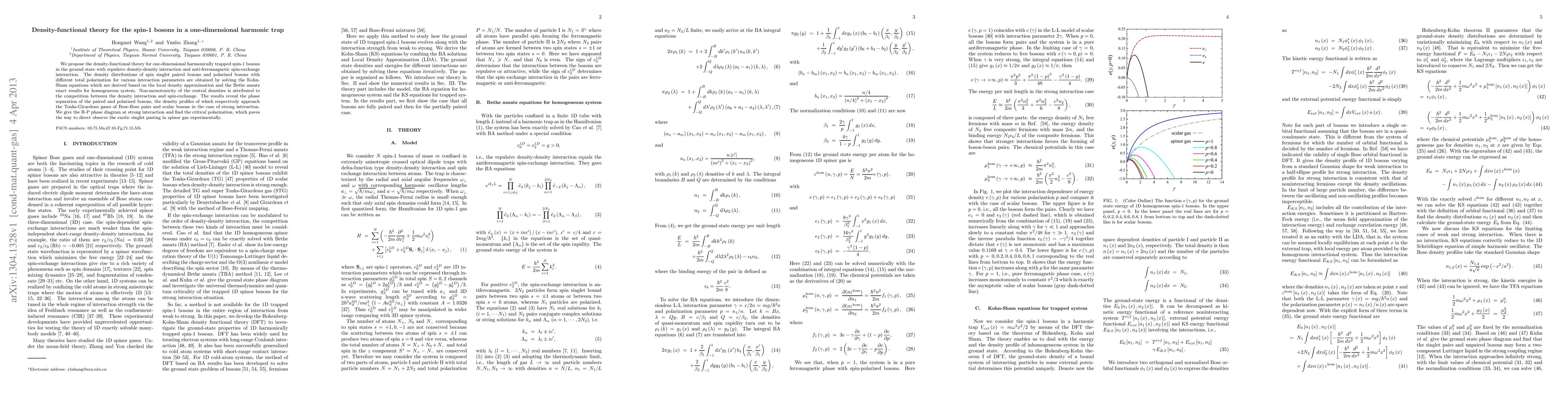 This paper proposes a density-functional theory for spin-1 bosons in a one-dimensional harmonic trap, revealing non-monotonic central densities due to interaction competition and predicting phase separation between paired and polarized bosons, with implications for observing singlet pairing in spinor gases.