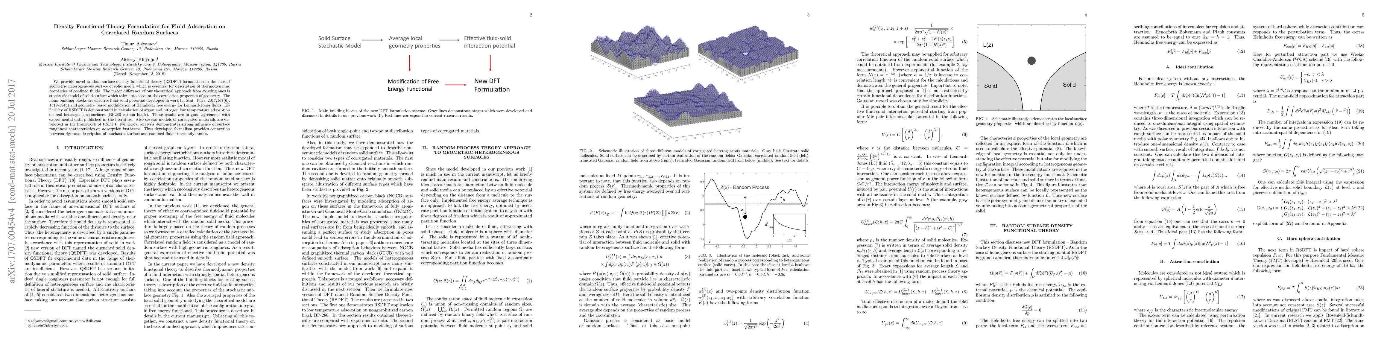 We provide novel random surface density functional theory (RSDFT) formulation in the case of geometric heterogeneous surface of solid media which is essential for description of thermodynamic properties of confined fluids. The major difference of our theoretical approach from existing ones is stochastic model of solid surface which takes into account the correlation properties of geometry. The main building blocks are effective fluid-solid potential developed in work (J. Stat. Phys, 2017,167(6), 1519-1545) and geometry based modification of Helmholtz free energy for Lennard-Jones fluids. Efficiency of RSDFT is demonstrated in calculation of argon and nitrogen low temperature adsorption on real heterogeneous surfaces (BP280 carbon black). These results are in good agreement with experimental data published in the literature. Also several models of corrugated materials are developed in the framework of RSDFT. Numerical analysis demonstrates strong influence of surface roughness characteristics on adsorption isotherms. Thus developed formalism provides connection between rigorous description of stochastic surface and confined fluids thermodynamics.