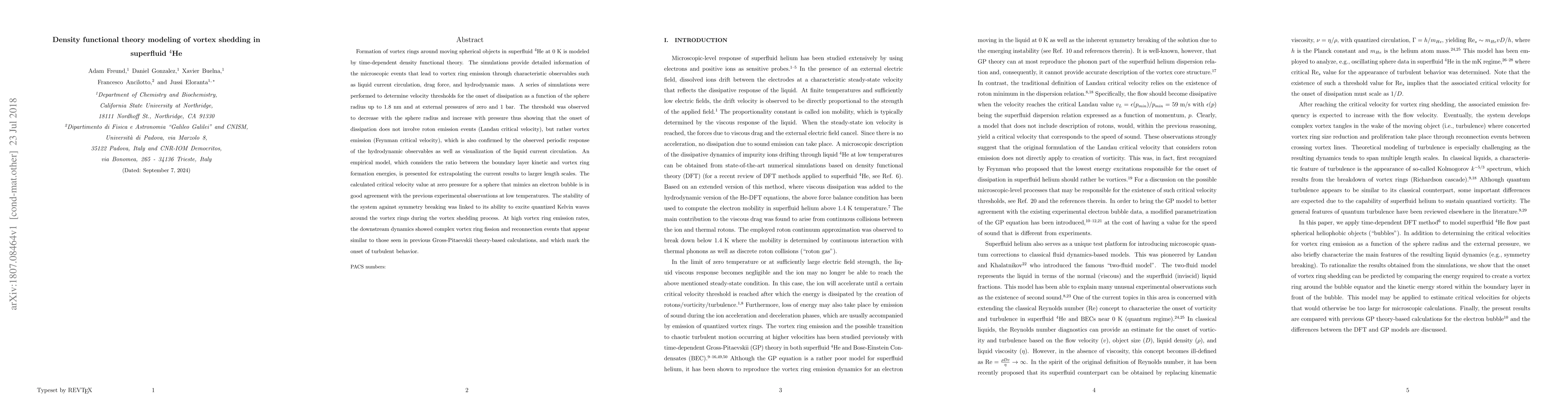 This paper uses density functional theory to model vortex shedding in superfluid He-4 around moving spheres, revealing that dissipation onset is linked to vortex emission rather than roton emission. The study also presents an empirical model for extrapolating results to larger scales and observes complex vortex dynamics at high emission rates.
