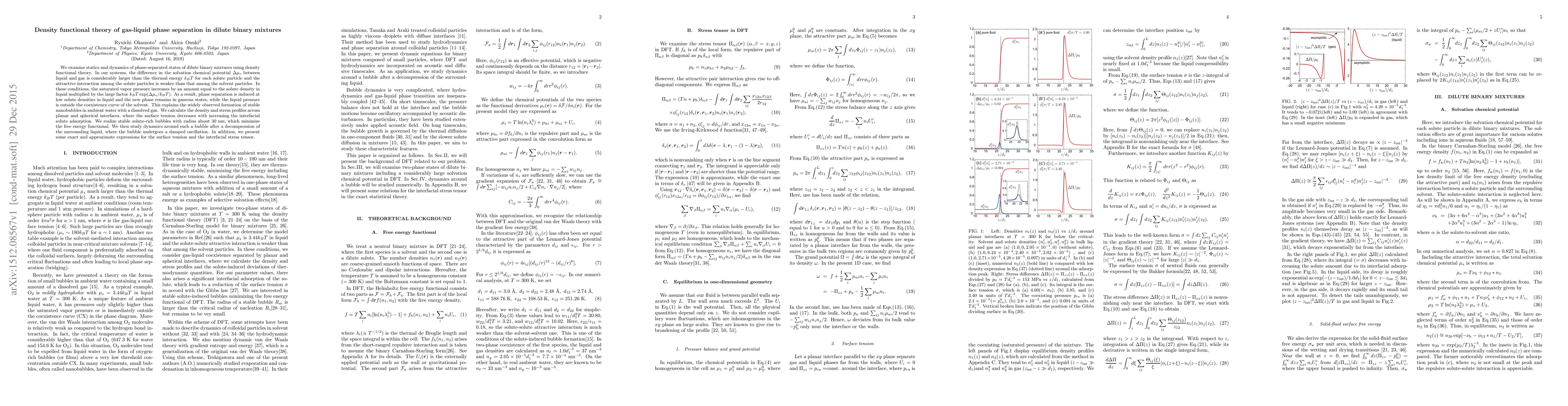 We examine statics and dynamics of phase-separated states of dilute binary mixtures using density functional theory. In our systems, the difference in the salvation chemical potential $\Delta\mu_s$ between liquid and gas is considerably larger than the thermal energy $k_BT$ for each solute particle and the attractive interaction among the solute particles is weaker than that among the solvent particles. In these conditions, the saturated vapor pressure increases by an amount equal to the solute density in liquid multiplied by the large factor $k_BT \exp(\Delta\mu_s/k_BT)$. As a result, phase separation is induced at low solute densities in liquid and the new phase remains in gaseous states, while the liquid pressure is outside the coexistence curve of the solvent. This explains the widely observed formation of stable nanobubbles in ambient water with a dissolved gas. We calculate the density and stress profiles across planar and spherical interfaces, where the surface tension decreases with increasing the interfacial solute adsorption. We realize stable solute-rich bubbles with radius about 30 nm, which minimize the free energy functional. We then study dynamics around such a bubble after a decompression of the surrounding liquid, where the bubble undergoes a damped oscillation. In addition, we present some exact and approximate expressions for the surface tension and the interfacial stress tensor.