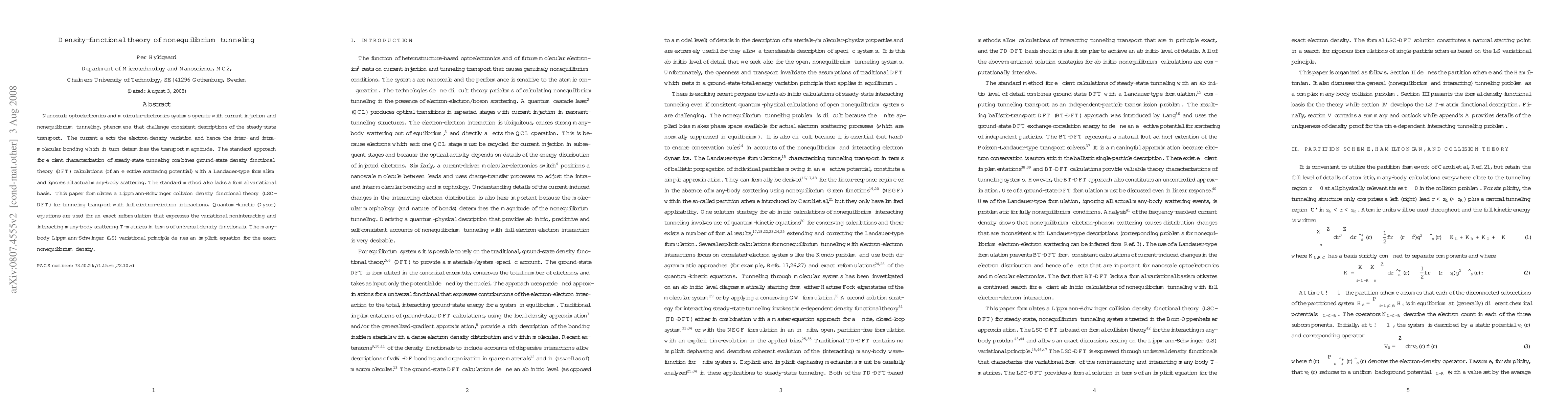 This paper introduces a novel density functional theory (LSC-DFT) for describing nonequilibrium tunneling in nanoscale optoelectronics and molecular systems, addressing limitations of current methods by incorporating full electron-electron interactions and providing a variational basis for tunneling transport.
