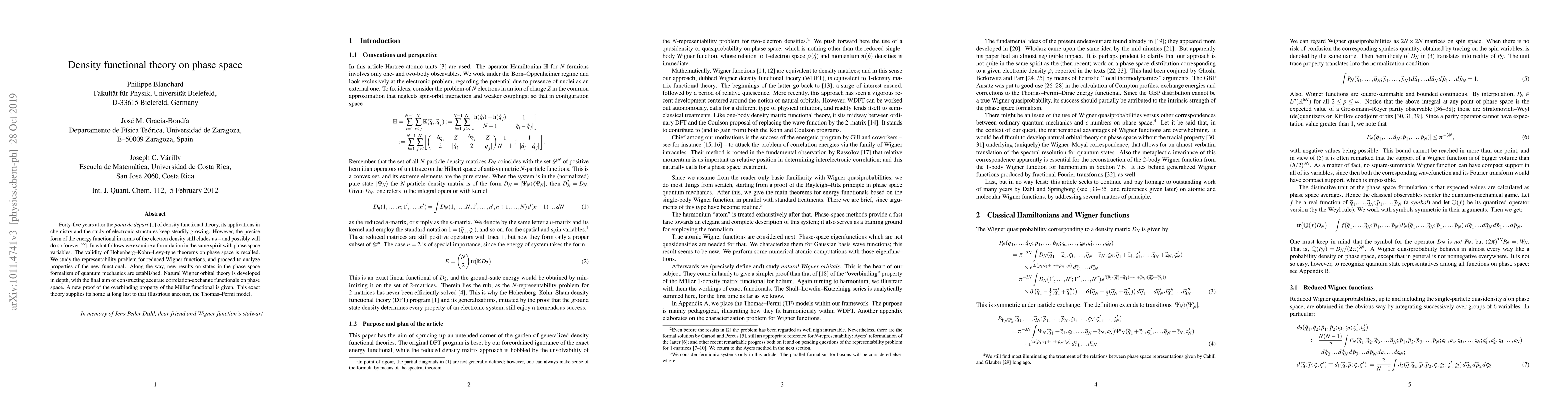 Forty-five years after the point de d\'epart [1] of density functional theory, its applications in chemistry and the study of electronic structures keep steadily growing. However, the precise form of the energy functional in terms of the electron density still eludes us -- and possibly will do so forever [2]. In what follows we examine a formulation in the same spirit with phase space variables. The validity of Hohenberg-Kohn-Levy-type theorems on phase space is recalled. We study the representability problem for reduced Wigner functions, and proceed to analyze properties of the new functional. Along the way, new results on states in the phase-space formalism of quantum mechanics are established. Natural Wigner orbital theory is developed in depth, with the final aim of constructing accurate correlation-exchange functionals on phase space. A new proof of the overbinding property of the Mueller functional is given. This exact theory supplies its home at long last to that illustrious ancestor, the Thomas-Fermi model.