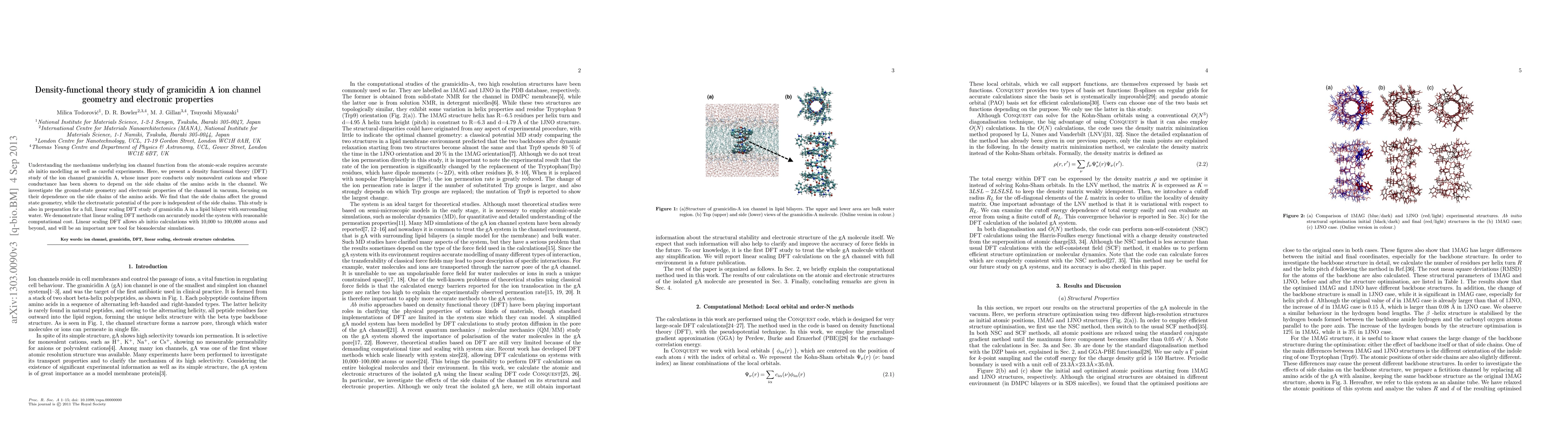 Understanding the mechanisms underlying ion channel function from the atomic-scale requires accurate ab initio modelling as well as careful experiments. Here, we present a density functional theory (DFT) study of the ion channel gramicidin A, whose inner pore conducts only monovalent cations and whose conductance has been shown to depend on the side chains of the amino acids in the channel. We investigate the ground-state geometry and electronic properties of the channel in vacuum, focusing on their dependence on the side chains of the amino acids. We find that the side chains affect the ground state geometry, while the electrostatic potential of the pore is independent of the side chains. This study is also in preparation for a full, linear scaling DFT study of gramicidin A in a lipid bilayer with surrounding water. We demonstrate that linear scaling DFT methods can accurately model the system with reasonable computational cost. Linear scaling DFT allows ab initio calculations with 10,000 to 100,000 atoms and beyond, and will be an important new tool for biomolecular simulations.