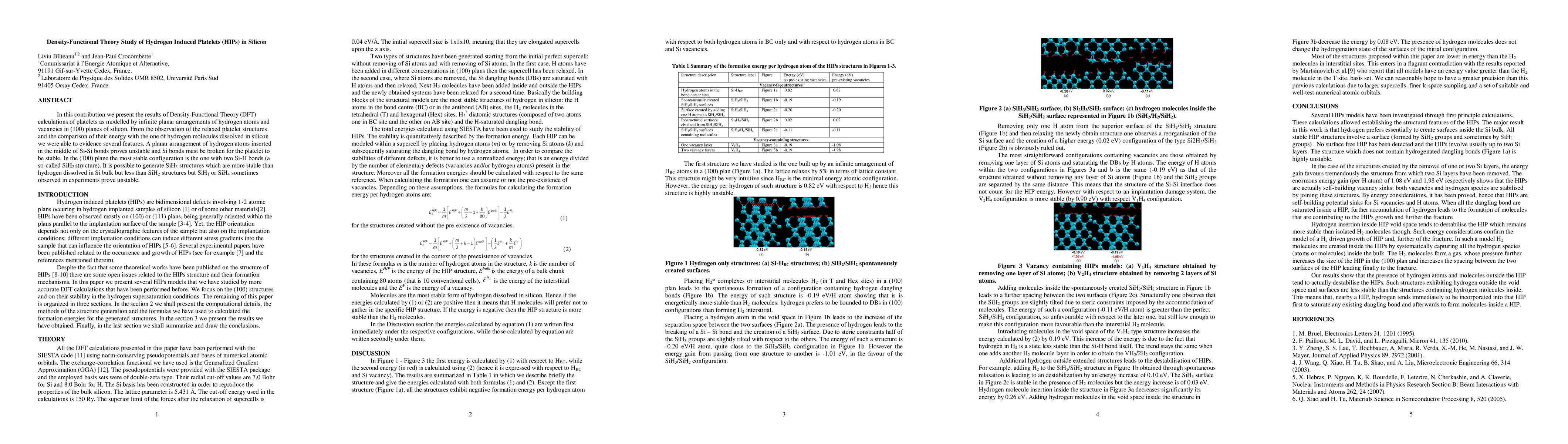 This study uses Density-Functional Theory (DFT) to investigate hydrogen-induced platelets (HIPs) in silicon, revealing that stable platelet structures require breaking Si-Si bonds. The most stable configuration in the (100) plane is the SiH2 structure, with SiH3 being more stable than dissolved hydrogen but less stable than SiH2.