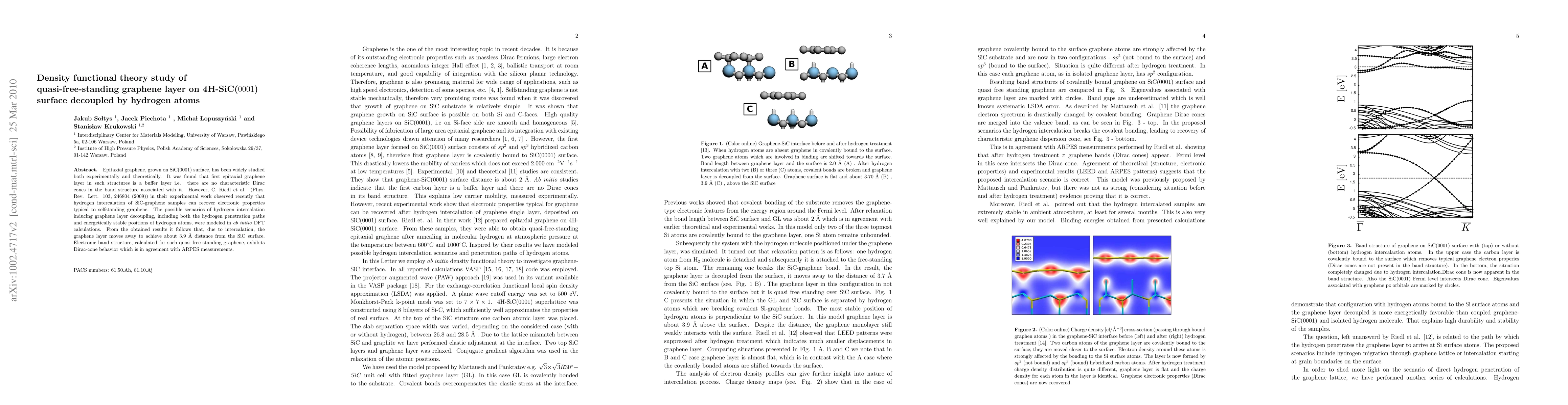 Epitaxial graphene, grown on SiC(0001) surface, has been widely studied both experimentally and theoretically. It was found that first epitaxial graphene layer in such structures is a buffer layer i.e. there are no characteristic Dirac cones in the band structure associated with it. However, C. Riedl et al. (Phys. Rev. Lett. 103, 246804 (2009)) in their experimental work observed recently that hydrogen intercalation of SiC-graphene samples can recover electronic properties typical to selfstanding graphene. The possible scenarios of hydrogen intercalation inducing graphene layer decoupling, including both the hydrogen penetration paths and energetically stable positions of hydrogen atoms, were modeled in ab initio DFT calculations. From the obtained results it follows that, due to intercalation, the graphene layer moves away to achieve about 3.9 A distance from the SiC surface. Electronic band structure, calculated for such quasi free standing graphene, exhibits Dirac-cone behavior which is in agreement with ARPES measurements.