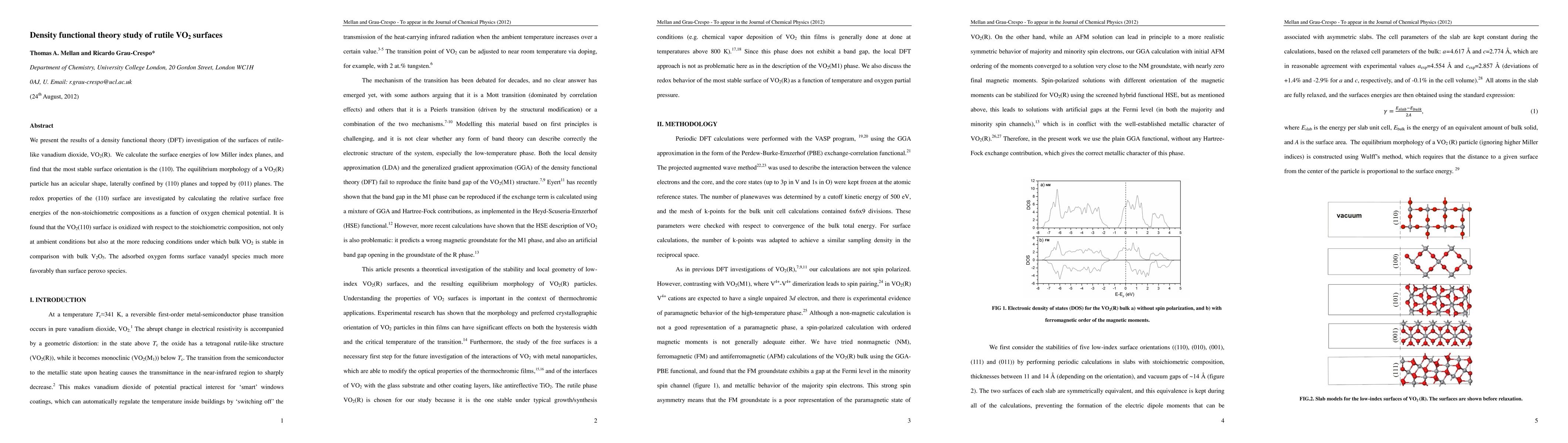 We present the results of a density functional theory (DFT) investigation of the surfaces of rutile-like vanadium dioxide, VO2(R). We calculate the surface energies of low Miller index planes, and find that the most stable surface orientation is the (110). The equilibrium morphology of a VO2(R) particle has an acicular shape, laterally confined by (110) planes and topped by (011) planes. The redox properties of the (110) surface are investigated by calculating the relative surface free energies of the non-stoichiometric compositions as a function of oxygen chemical potential. It is found that the VO2(110) surface is oxidized with respect to the stoichiometric composition, not only at ambient conditions but also at the more reducing conditions under which bulk VO2 is stable in comparison with bulk V2O5. The adsorbed oxygen forms surface vanadyl species much more favorably than surface peroxo species.