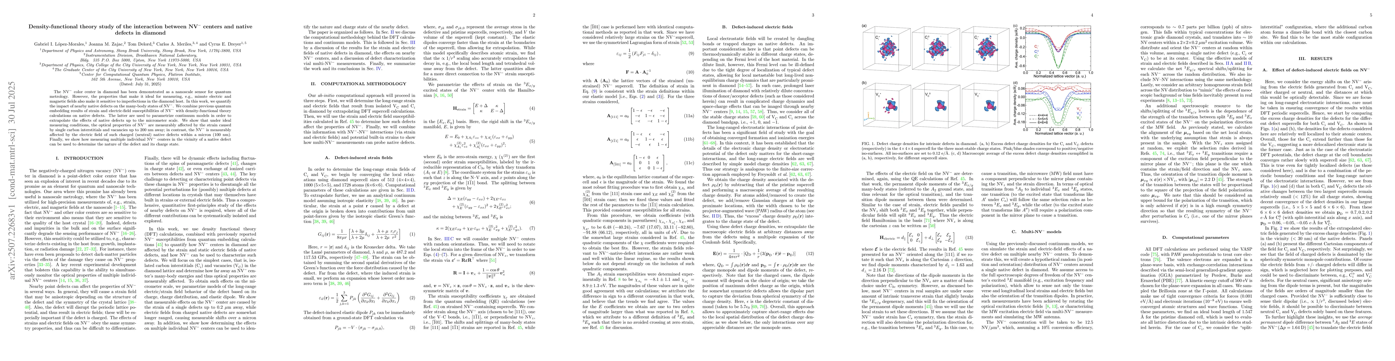 This research utilized density-functional theory (DFT) calculations to study the impact of native defects on nearby NV− centers in diamond, combining previous quantum embedding results with DFT to parametrize continuum models for extrapolation to micrometer scales.