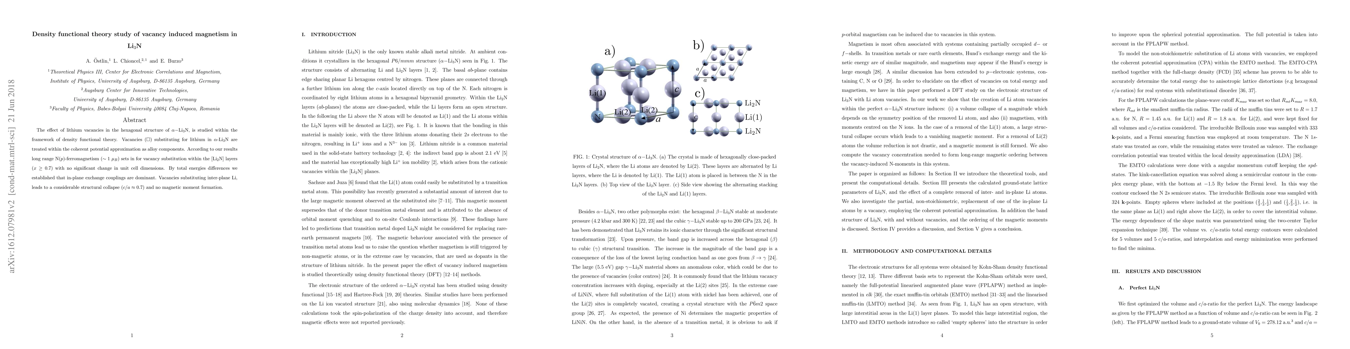 The effect of lithium vacancies in the hexagonal structure of $\alpha-$Li$_3$N, is studied within the framework of density functional theory. Vacancies ($\square$) substituting for lithium in $\alpha-$Li$_2$(Li$_{1-x}\square_x$)N are treated within the coherent potential approximation as alloy components. According to our results long range N($p$)-ferromagnetism ($\sim 1$ $\mu_B$) sets in for vacancy substitution within the [Li$_2$N] layers ($x \ge 0.7$) with no significant change in unit cell dimensions. By total energies differences we established that in-plane exchange couplings are dominant. Vacancies substituting inter-plane Li, leads to a considerable structural collapse ($c/a \approx 0.7$) and no magnetic moment formation.