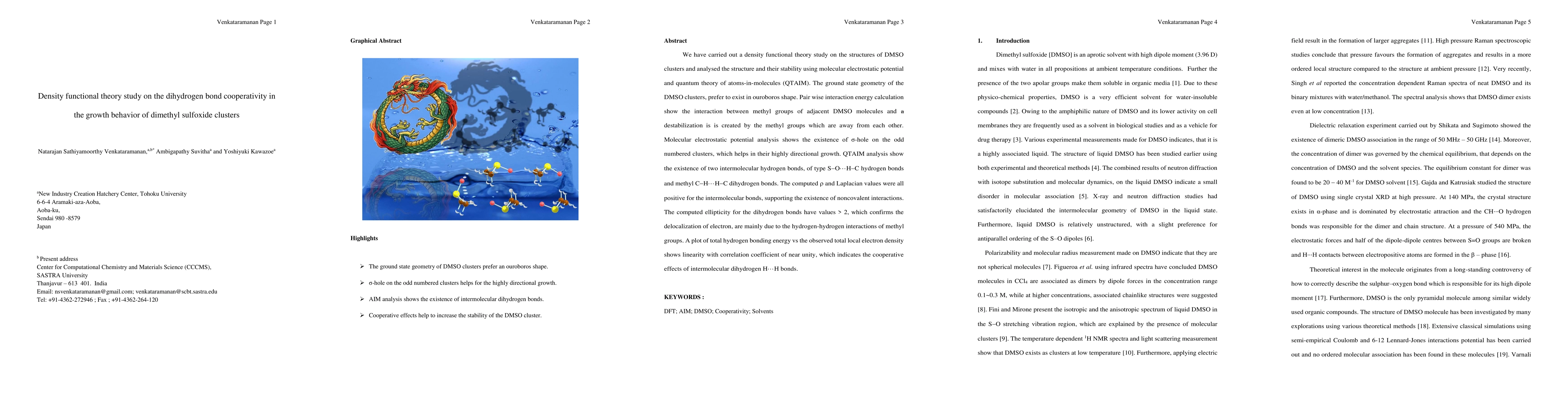 We have carried out a density functional theory study on the structures of DMSO clusters and analysed the structure and their stability using molecular electrostatic potential and quantum theory of atoms-in-molecules (QTAIM). The ground state geometry of the DMSO clusters, prefer to exist in ouroboros shape. Pair wise interaction energy calculation show the interaction between methyl groups of adjacent DMSO molecules and a destabilization is is created by the methyl groups which are away from each other. Molecular electrostatic potential analysis shows the existence of hole on the odd numbered clusters, which helps in their highly directional growth. QTAIM analysis show the existence of two intermolecular hydrogen bonds, of type SOC hydrogen bonds and methyl CHC dihydrogen bonds. The computed and Laplacian values were all positive for the intermolecular bonds, supporting the existence of noncovalent interactions. The computed ellipticity for the dihydrogen bonds have values > 2, which confirms the delocalization of electron, are mainly due to the hydrogen-hydrogen interactions of methyl groups. A plot of total hydrogen bonding energy vs the observed total local electron density shows linearity with correlation coefficient of near unity, which indicates the cooperative effects of intermolecular dihydrogen HH bonds.