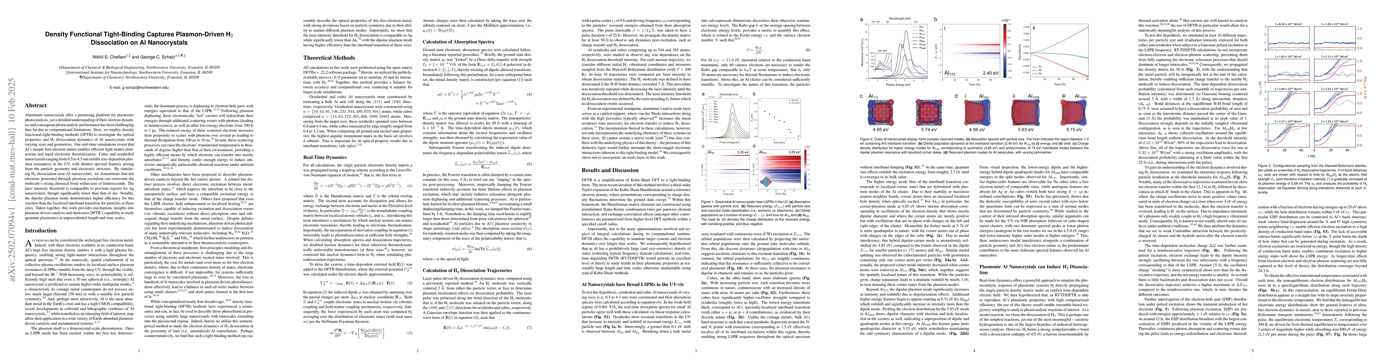 The application of DFTB methods to study plasmonic Al nanocrystals, capturing their optical properties and H2 dissociation dynamics with high computational efficiency.