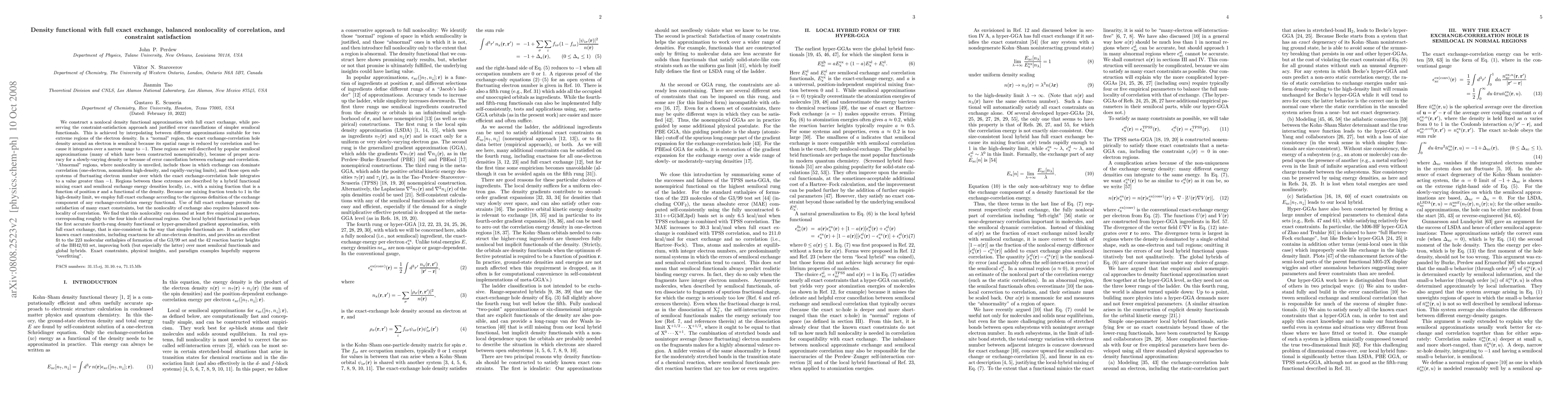 This paper introduces a novel nonlocal density functional approximation that incorporates full exact exchange, balanced nonlocal correlation, and constraint satisfaction. The functional interpolates between semilocal and hybrid approaches to accurately describe both normal and abnormal regions of electron density, achieving superior performance in predicting molecular enthalpies and reaction barriers compared to existing semilocal and global hybrid functionals.