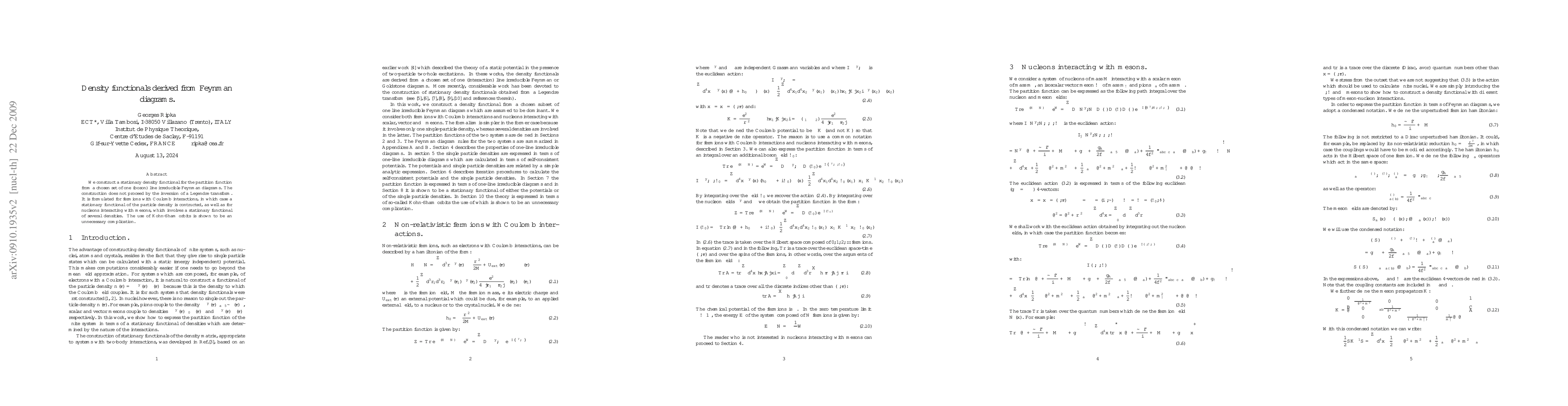 Researchers develop a new method to derive density functions from Feynman diagrams, enabling calculations of partition functions for fermions and nucleons interacting with mesons, without the need for unnecessary complications like Kohn-Sham orbits.