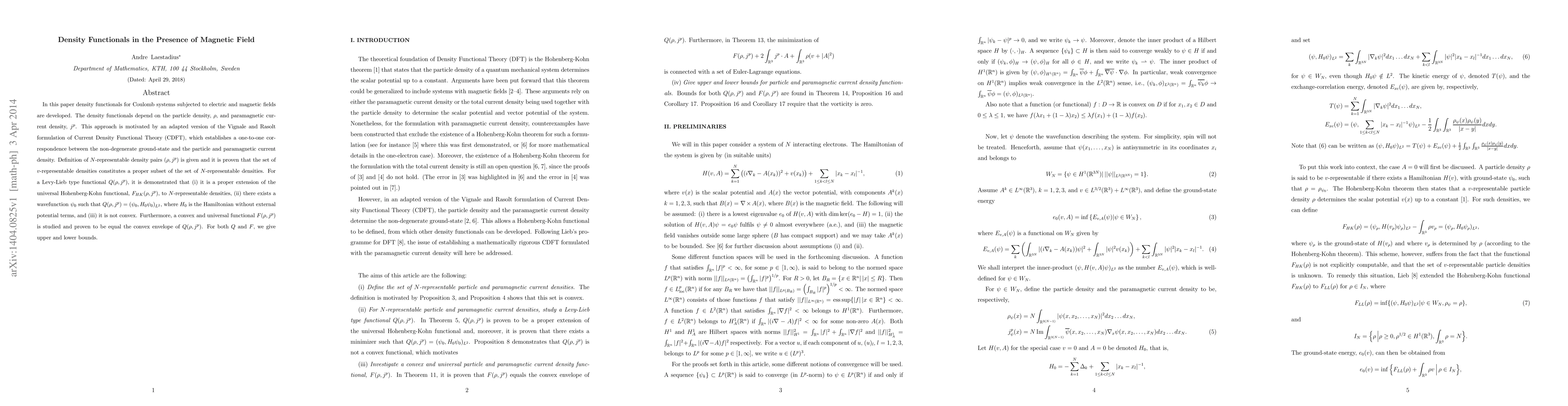 In this paper density functionals for Coulomb systems subjected to electric and magnetic fields are developed. The density functionals depend on the particle density, $\rho$, and paramagnetic current density, $j^p$. This approach is motivated by an adapted version of the Vignale and Rasolt formulation of Current Density Functional Theory (CDFT), which establishes a one-to-one correspondence between the non-degenerate ground-state and the particle and paramagnetic current density. Definition of $N$-representable density pairs $(\rho,j^p)$ is given and it is proven that the set of $v$-representable densities constitutes a proper subset of the set of $N$-representable densities. For a Levy-Lieb type functional $Q(\rho,j^p)$, it is demonstrated that (i) it is a proper extension of the universal Hohenberg-Kohn functional, $F_{HK}(\rho,j^p)$, to $N$-representable densities, (ii) there exists a wavefunction $\psi_0$ such that $Q(\rho,j^p)=(\psi_0,H_0\psi_0)_{L^2}$, where $H_0$ is the Hamiltonian without external potential terms, and (iii) it is not convex. Furthermore, a convex and universal functional $F(\rho,j^p)$ is studied and proven to be equal the convex envelope of $Q(\rho,j^p)$. For both $Q$ and $F$, we give upper and lower bounds.