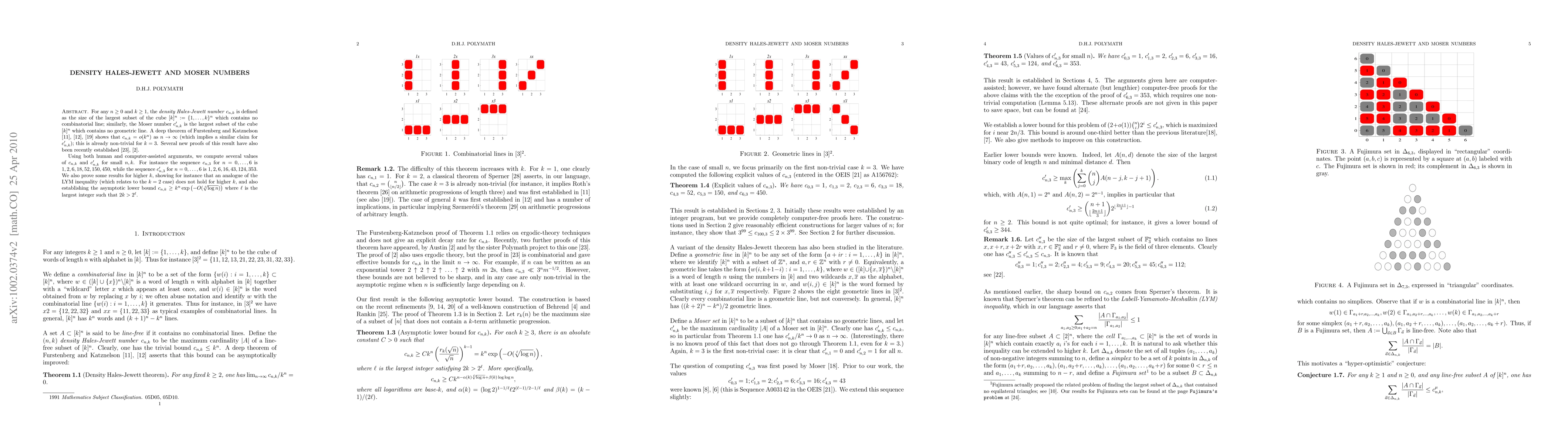 For any $n \geq 0$ and $k \geq 1$, the \emph{density Hales-Jewett number} $c_{n,k}$ is defined as the size of the largest subset of the cube $[k]^n$ := $\{1,...,k\}^n$ which contains no combinatorial line; similarly, the Moser number $c'_{n,k}$ is the largest subset of the cube $[k]^n$ which contains no geometric line. A deep theorem of Furstenberg and Katznelson shows that $c_{n,k}$ = $o(k^n)$ as $n \to \infty$ (which implies a similar claim for $c'_{n,k}$); this is already non-trivial for $k = 3$. Several new proofs of this result have also been recently established. Using both human and computer-assisted arguments, we compute several values of $c_{n,k}$ and $c'_{n,k}$ for small $n,k$. For instance the sequence $c_{n,3}$ for $n=0,...,6$ is $1,2,6,18,52,150,450$, while the sequence $c'_{n,3}$ for $n=0,...,6$ is $1,2,6,16,43,124,353$. We also prove some results for higher $k$, showing for instance that an analogue of the LYM inequality (which relates to the $k = 2$ case) does not hold for higher $k$, and also establishing the asymptotic lower bound $c_{n,k} \geq k^n \exp(- O(\sqrt[\ell]{\log n}))$ where $\ell$ is the largest integer such that $2k > 2^\ell$.