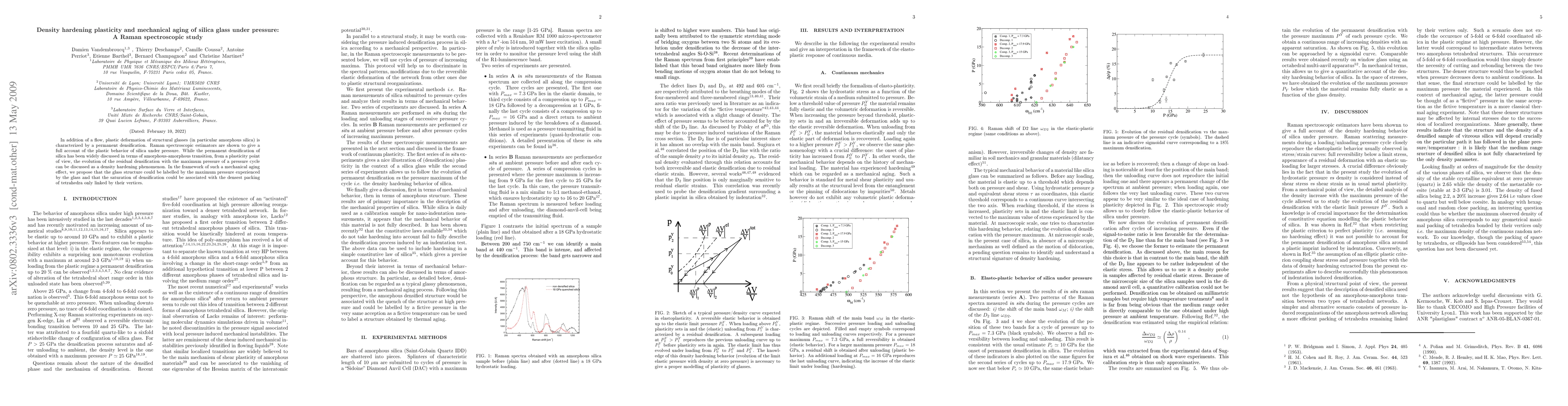 This study uses Raman spectroscopy to analyze the plastic deformation and permanent densification of silica glass under pressure, proposing a density hardening mechanism linked to mechanical aging. The research suggests that the maximum pressure experienced by the glass determines its structural label, with saturation of densification tied to the densest possible tetrahedral packing.
