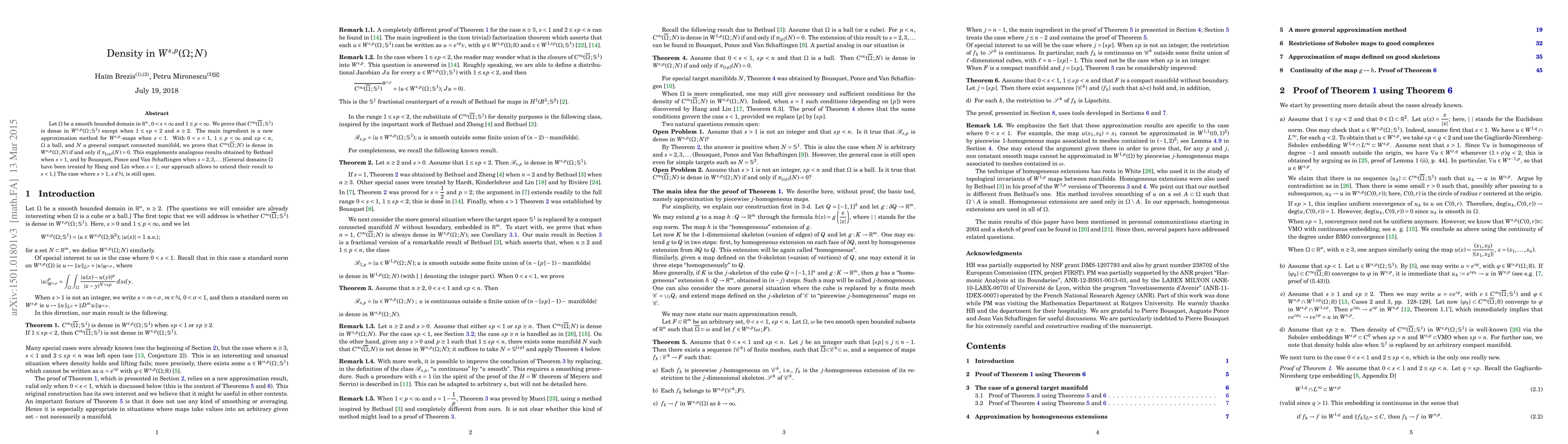 This paper investigates the density of smooth functions in Sobolev spaces $W^{s,p}(\Omega; N)$ for a smooth bounded domain $\Omega$ in ${\mathbb R}^n$. It proves that smooth functions on $\overline\Omega$ are dense in $W^{s,p}(\Omega; {\mathbb S}^1)$ except when $1\le sp < 2$ and $n\ge 2$, using a new approximation method for $s<1$.