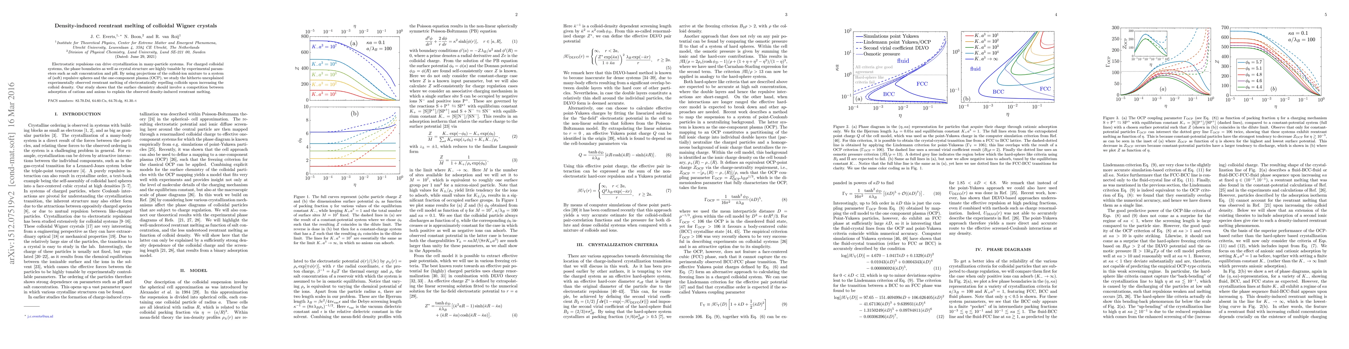 This paper investigates the phenomenon of density-induced reentrant melting in colloidal Wigner crystals, explaining how increasing colloid density leads to a phase transition despite electrostatic repulsions. The study reveals that surface chemistry involving cation and anion adsorption competition plays a crucial role in this behavior.