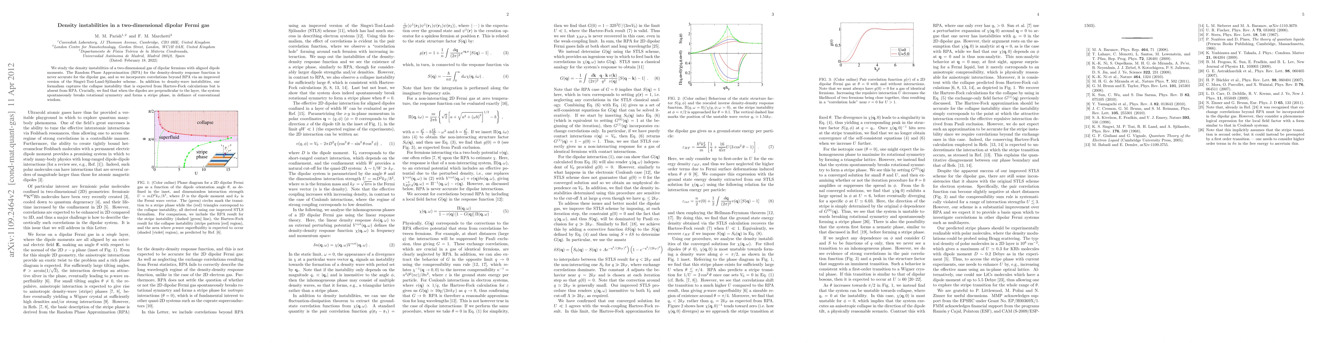 This paper investigates the density instabilities in a two-dimensional dipolar Fermi gas, demonstrating that the Random Phase Approximation is insufficient. It employs an enhanced Singwi-Tosi-Land-Sjolander scheme to capture density-wave and collapse instabilities, revealing a stripe phase with spontaneous rotational symmetry breaking when dipoles are perpendicular to the layer.